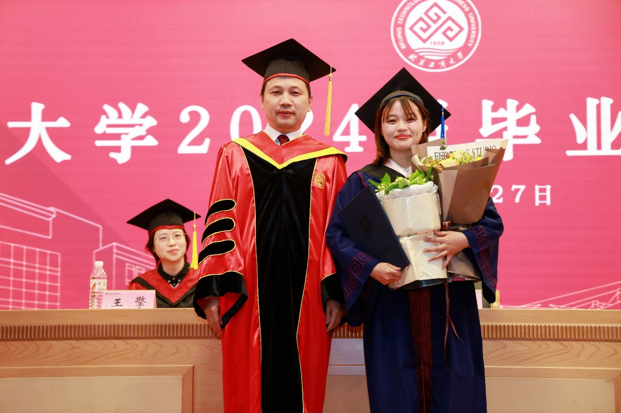 毕业生们依次上台,由刘影书记,王擎院长,张慧子副院长,史岩林副院长为同学们颁发毕业证书和学位证书,拨苏正冠。