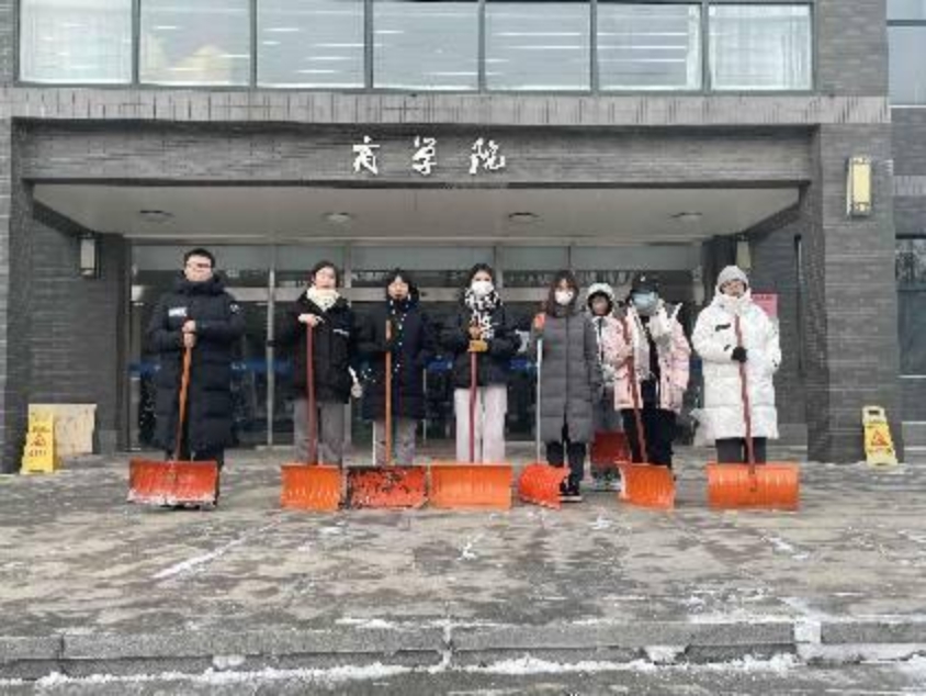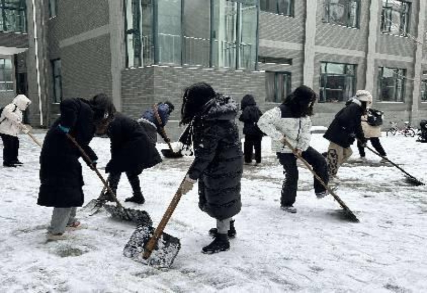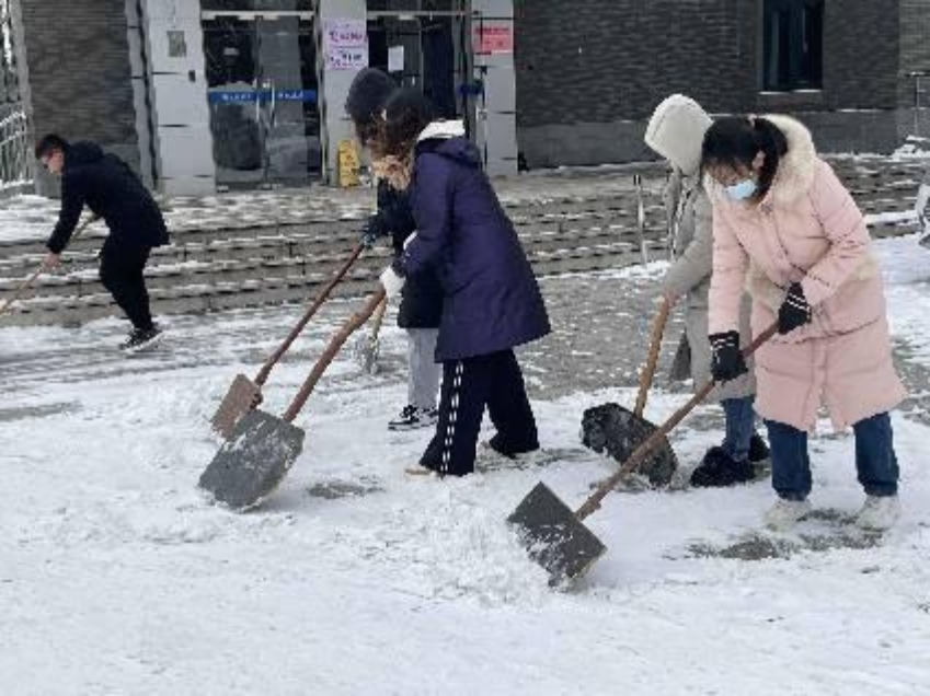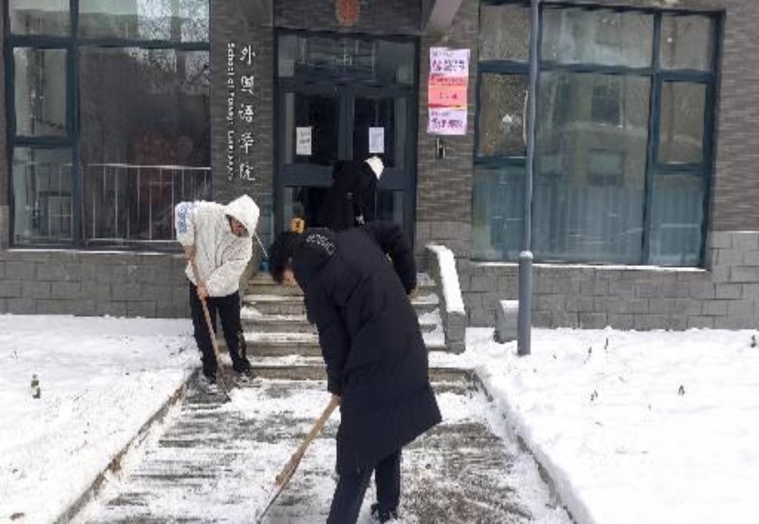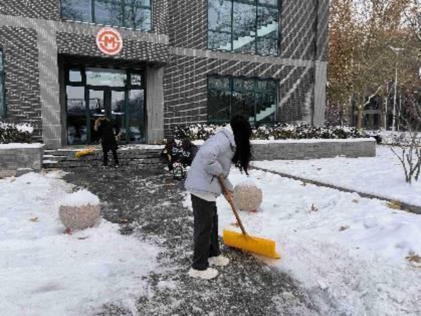 在学院的带领下,学生志愿者也积极行动起来,开展扫雪除冰劳动实践。学生们拿起除雪工具,推、铲、扬、堆,各种方法齐上阵,有条不紊地将学院楼宇门口和道路上积雪路面逐一清理干净,让青春闪耀在冰雪世界,将爱与温暖传递在校园的每个角落。