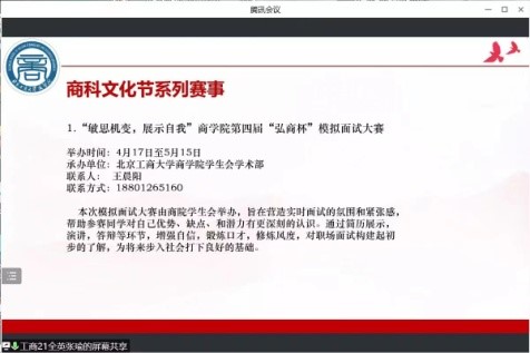 为加强学风建设,促进学生专业实践能力提升,培养优秀商科人才,引导学生在居家学习之余参加学术竞赛活动,商学院第十届商科文化节开幕式于4月13日线上举行。本届商科文化节的主题是“承商科之志,筑青春梦想”,参加开幕式的有学院党委副书记张倩、团委书记及各年级辅导员,邀请了五位优秀学生代表进行经验分享,活动吸引了近300名本科生参加。