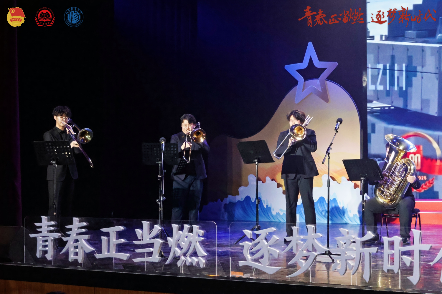 展演现场,我校管乐团王晨、曹杉、赵奕然、曾厚栋、王元昊、耿玺、王旭岩、任畅等同学倾情演绎低音铜管重奏《钢铁洪流进行曲》,以恢弘磅礴的旋律点燃全场热情。该作品承载着不屈不挠的抗战精神。值此中国人民抗日战争暨世界反法西斯战争胜利80周年之际,学子们以铿锵音符致敬革命先烈,赓续红色血脉,彰显新时代青年“强国有我”的使命担当。乐团成员来自不同学院、不同专业,在指导教师代美川子的带领下,以高度默契与精湛技艺,展现出扎实的艺术素养和昂扬向上的精神风貌,赢得现场观众热烈掌声。