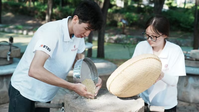 习近平总书记指出“坚持执政为民的政治立场,始终保持同人民群众的密切联系。”在八路军文化园,同学们积极参与沉浸式体验活动。推石磨见军民合力,推独轮车悟“小推车推大胜利”,在挥汗如雨的实践体验中,同学们深刻领悟“军民同心”的丰富内涵。在“八路军抗日”情景演绎中,分组对战的迂回交锋,让“游击战”的战略智慧从书本走向鲜活;钻行于“地下长城”时,军民共筑防御线的创造力与凝聚力,更化作直抵人心的深切体悟。“原来历史不是书本上的文字,而是能亲手触摸、亲身参与的记忆。”来自经济学院的张静瑶同学感叹道。