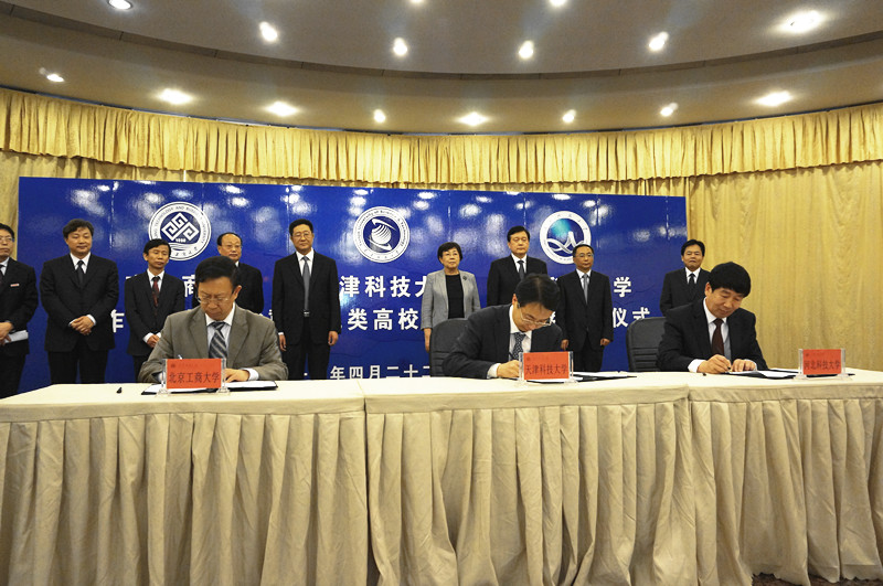 4月22日,我校与天津科技大学、河北科技大学合作签约暨京津冀轻工类高校协同创新联盟揭牌仪式在天津科技大学举行。我校校长孙宝国、副校长方德英以及天津科技大学、河北科技大学校领导参加会议,天津市副市长曹小红、天津市教委主任王璟出席本次活动。会议由天津科技大学校长王硕主持。