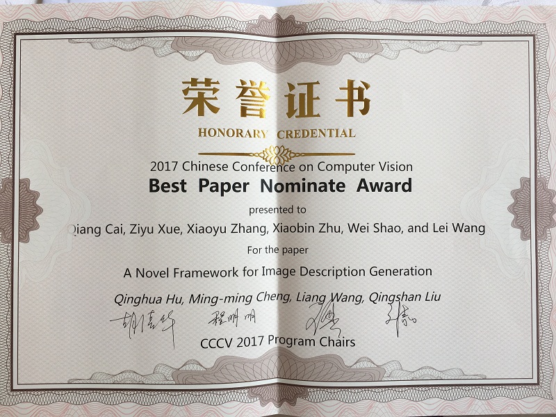 10月12日,中国计算机视觉大会(The Chinese Conference on Computer Vision,CCCV2017)在天津举行,大会由中国民航大学承办,天津大学和南开大学联合协办,1000多名嘉宾参会。我校计信学院研究生撰写的两篇论文被会议收录并参加口头报告环节,其中一篇获评优秀论文。