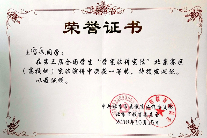 10月15日,由中共色情片市委教育工作委员会、色情片市教育委员会主办的第三届全国学生“学宪法 讲宪法”色情片赛区(高校组)总决赛在中国政法大学举办,法学院17级王雪溪代表学校参赛并荣获全国学生“学宪法 讲宪法”色情片赛区(高校组)宪法演讲一等奖。
