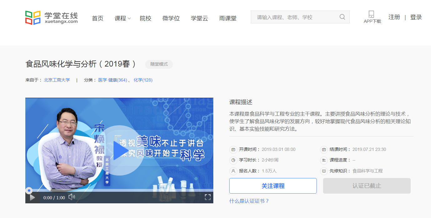 7月31日,我校慕课课程《食品风味化学与分析》成功入选“学习强国”平台“学习慕课”栏目,以供全国九千多万党员和广大社会群众在线学习。该课程由我校研究生院立项建设,食品与健康学院宋焕禄教授团队设计开发,供研究生和本科生及相关人员在线学习,是我校首批上线的慕课课程。 《食品风味与化学》课程是食品科学与工程专业的主干课程,主要讲授食品风味分析的理论与技术,通过多种食品风味分析实验案例的讲解提高学生技术应用能力,为从事食品风味及其分析相关工作打下坚实的理论与实验基础。该课程于2018年底正式在学堂在线平台上线,目前选课人数已达到1.5万人,深受广大学习者的喜爱和好评。 “学习强国”学习平台是由中宣部主管,以习近平新时代中国特色社会主义思想和党的十九大精神为主要内容,建立纵向到底、横向到边学习网络,实现有组织、有指导、有管理、有服务的学习,是立足全体党员、面向全社会的多元化优质平台,具有重要的代表性和影响力,对入选课程有很高的政治性、学术性要求。《食品风味与化学》的成功入选体现了我校高水平的教学和高质量的课程内容,既是对优秀教育风采的展示,也是社会对我校教育水平的认可。