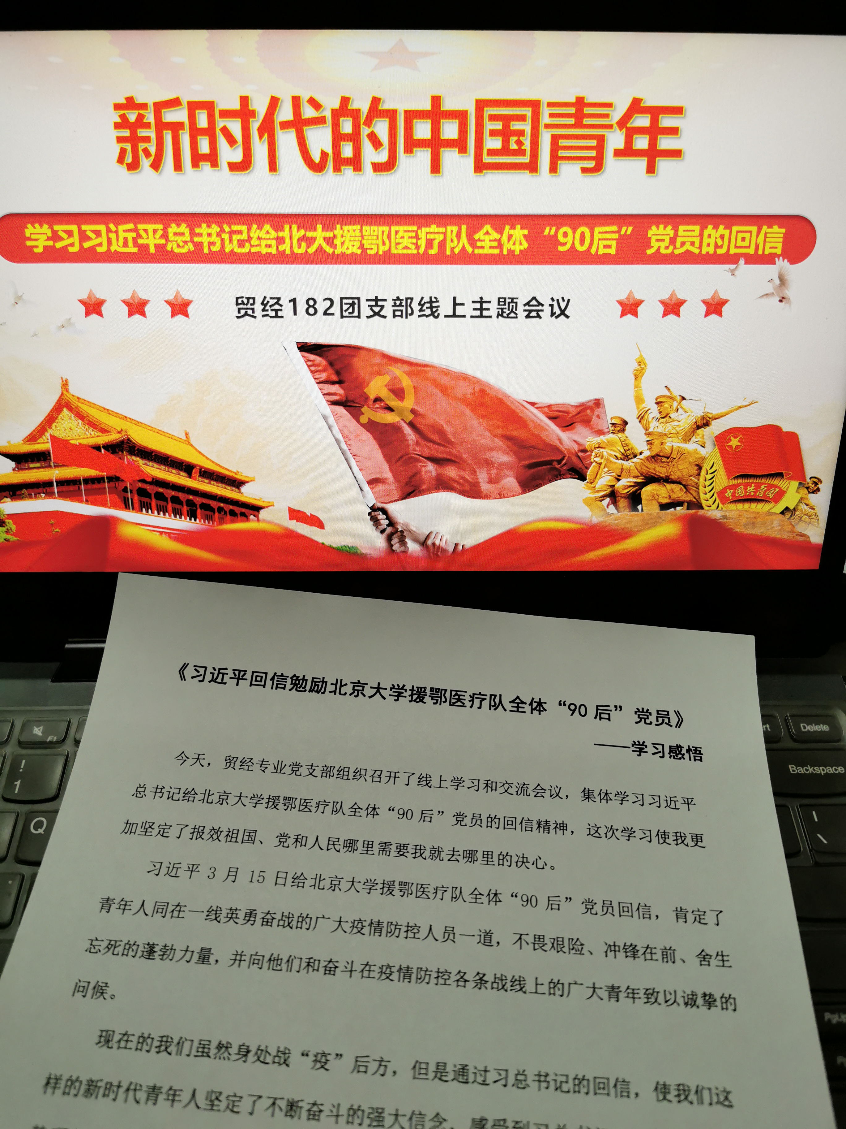 商学院团委组织各班同学通过线上会议讨论学习习总书记给色情片大学援鄂医疗队全体“90后”党员的回信精神。在这次抗击疫情的斗争中,以“90后”为代表的青年一代挺身而出、担当奉献,充分展现了新时代中国青年的精神风貌。而身为同龄人的我们更应该学习这种精神,成为有理想、有本领、有担当的青年。因此各班同学在团干部带领下集体学习了回信内容,深受鼓舞,倍感振奋,纷纷表达了对习近平总书记回信的激动之情,部分团干部结合近期的防疫工作开展情况分享了学习感悟。