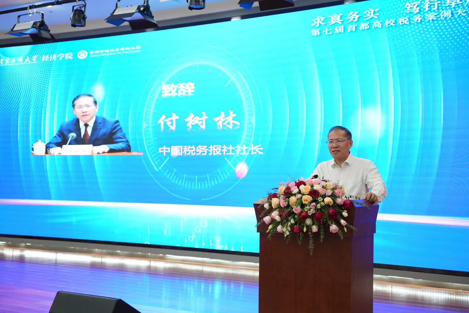 吕良作总结发言。他表示,案例是税务教学的阶梯,比赛是检验教学的沙场。第七届首都高校税务案例大赛的成功举办,帮助同学们了解最新的税务动态和法规变化,发现并跟踪税务实践中的切实问题。在以赛促学、以赛促教、学以致用的理念下,大赛不仅锻炼了同学们的实践应用能力,考验了团队协作能力和现场展示能力,也增强了首都高校师生为国家税务事业做出贡献的决心和理想。希望今后与首都各高校并肩携手,提高税务专业人才培养质量,促进实践能力提升,为我国税收系统不断输送高质量的专业人才队伍。最后,詹新宇宣布第七届税务案例大赛圆满结束,并预祝下一届税务案例大赛更为精彩。