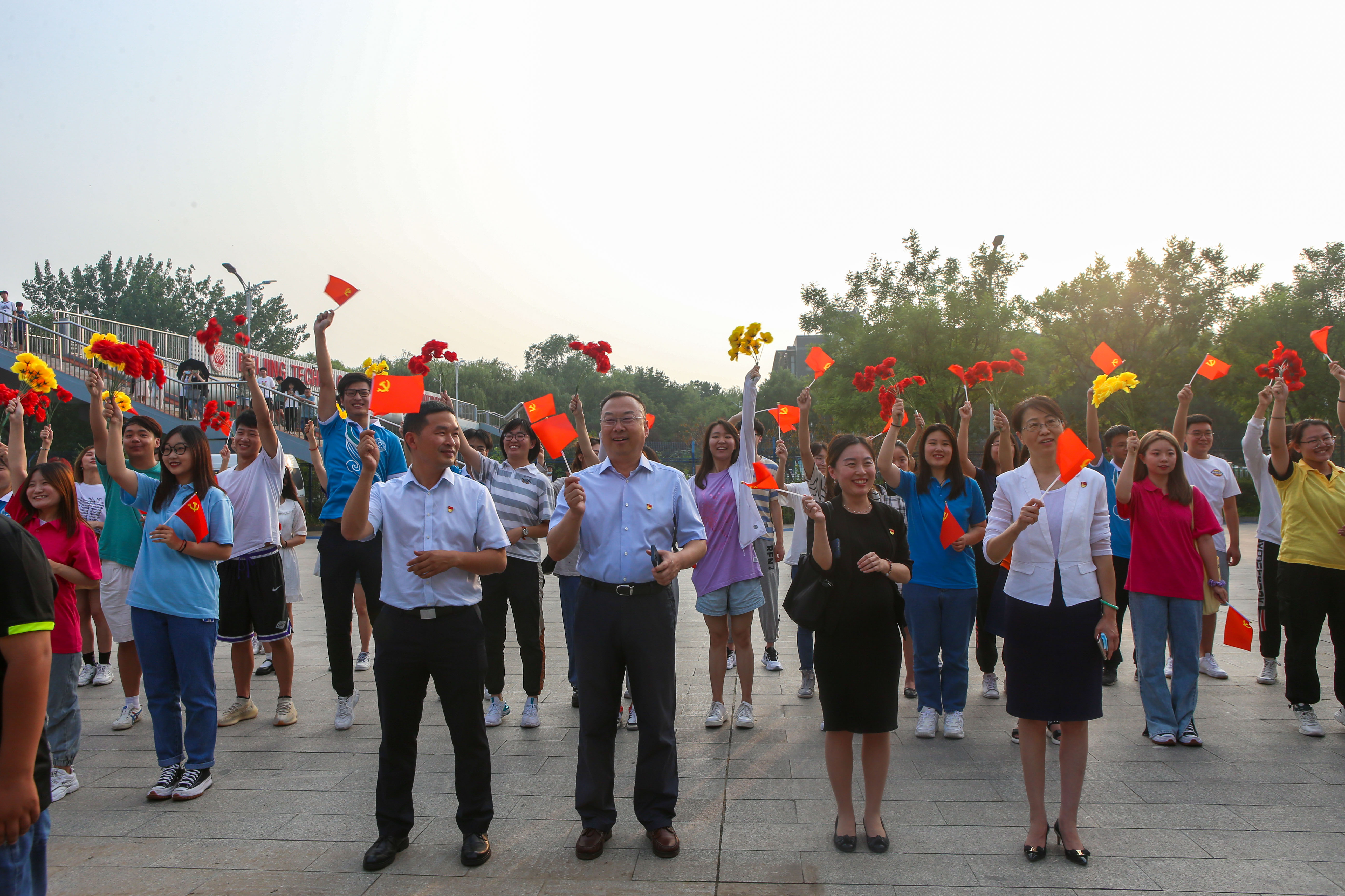 “唱支山歌给党听,我把党来比母亲……”6月28日下午,学校良乡主校区传出了一阵阵悠扬而又动人的歌声。数百名同学伴着悠扬的音乐,挥舞着手中的党旗和花朵,洋溢着青春活力在图书馆广场激情高歌。“奋进百年路,启航新征程”北工商团员青年唱响百年颂歌主题教育“快闪”正在上演。学校党委副书记李中奇出席活动。相关职能部门负责人与同学们一起,用歌声唱响党的百年颂歌。