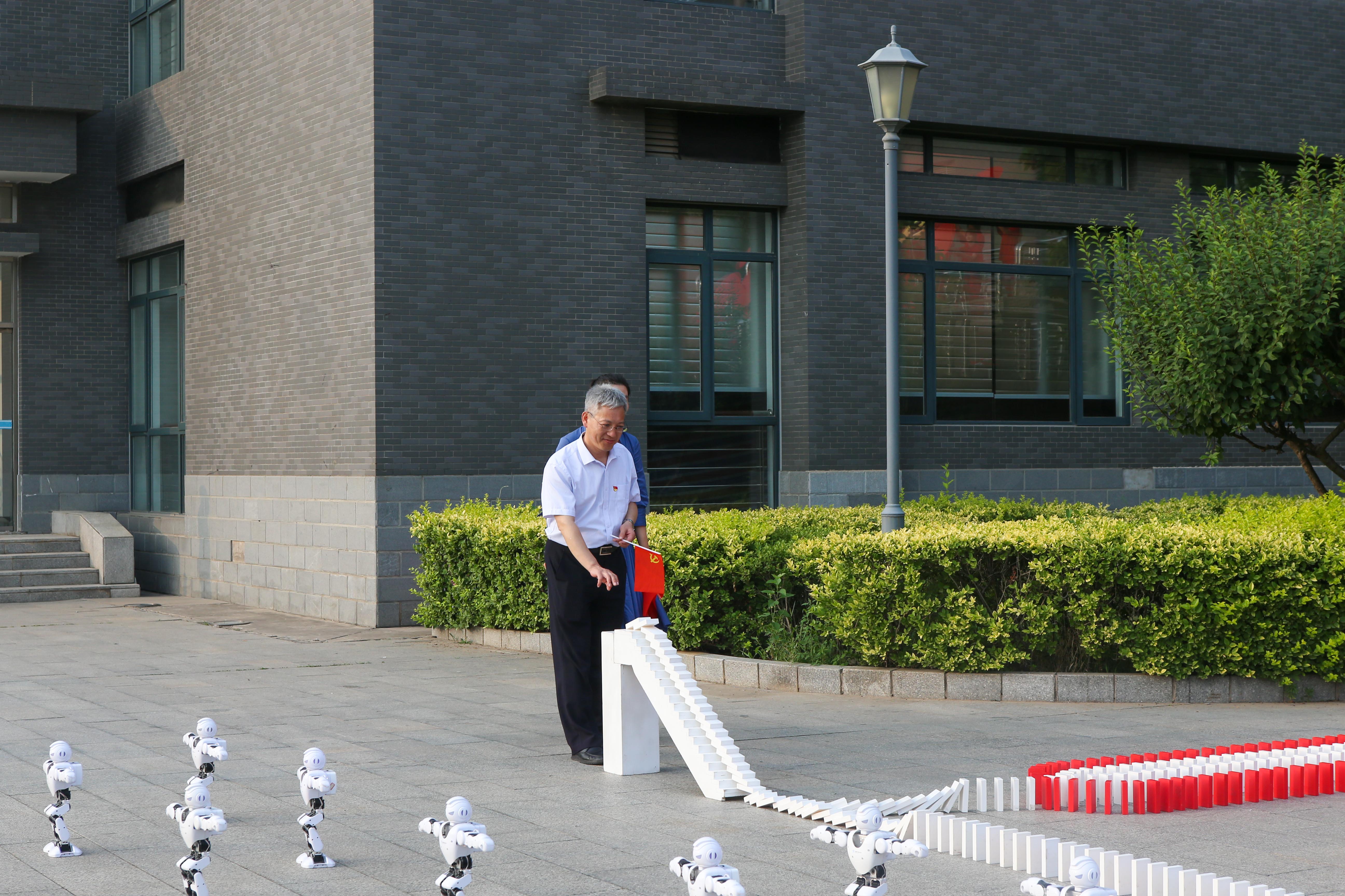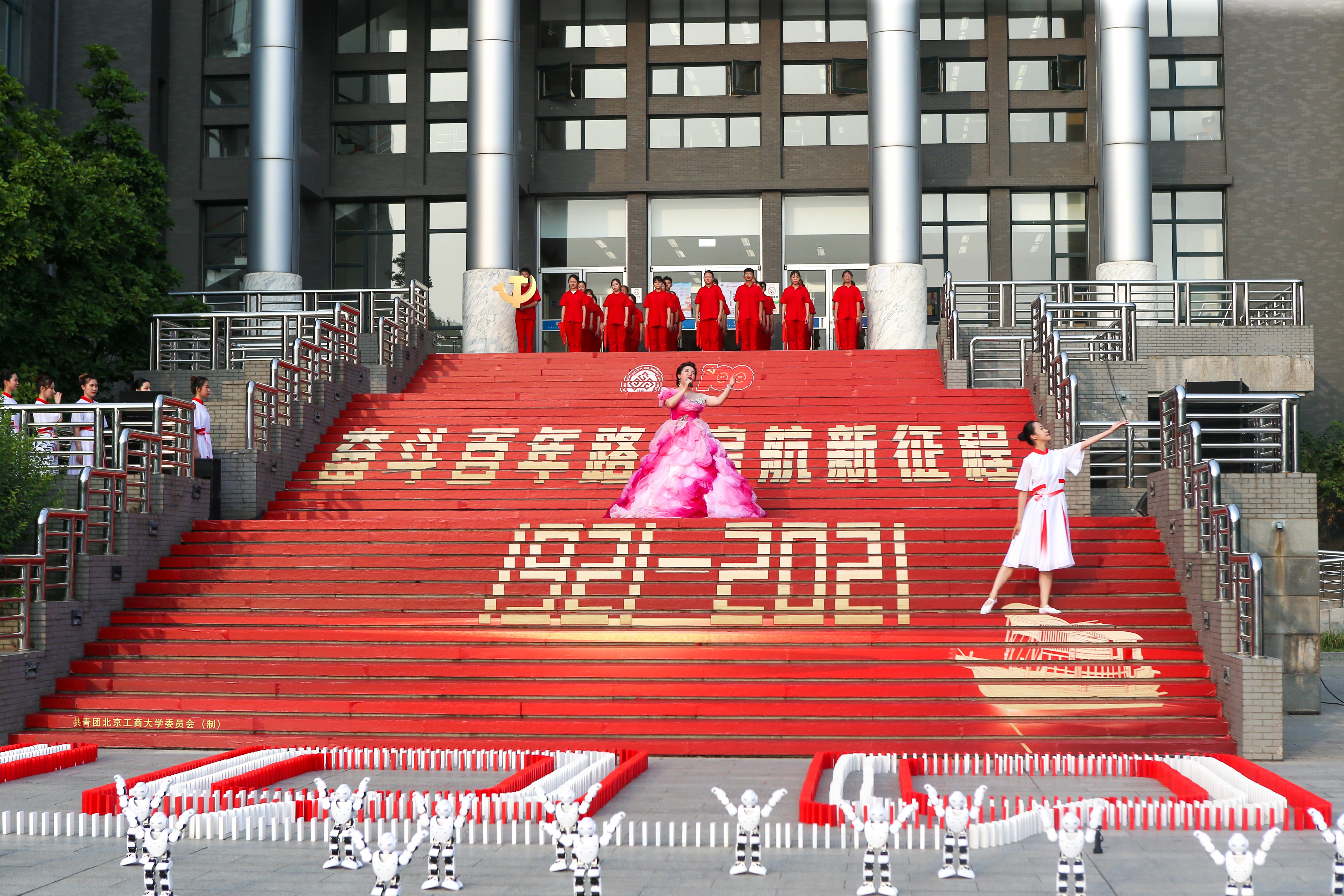 傍晚6时整,图书馆前成了一片红色的海洋,20米红色巨布铺满三层长阶, 镌刻着“1921-2021”的字样和金色红船的图案,营造成热烈而浓郁的氛围,让现场师生联想到从上海石库门到嘉兴南湖,一艘小小红船承载着人民的重托、民族的希望,越过急流险滩,穿过惊涛骇浪,航行百年,成为领航中国行稳致远的巍巍巨轮。伴随着管乐器吹奏着《唱支山歌给党听》悠扬乐曲,刚刚下课的同学们三三两两,纷纷循声汇聚到图书馆前。管弦乐曲罢,领唱体育与艺术教学部丁璇用动听而又极富感染力的歌声唱响《我爱你,中国》,歌声里满是对祖国未来的憧憬和对党百年征程的歌颂。红色长阶上数十名舞者身着白衣红裙翩翩起舞,妙态绝伦。二十五个智能舞蹈机器人摆成党徽的形状,跟着歌声的节奏跳动,整齐划一,灵动的舞姿和可爱的形象俘获了现场师生的心,象征着北工商学子整装待发,开启百年新征程的意志。人工智能学院的“NAO”机器人矗立在舞蹈机器人的前方,指引方向,代表着工商青年坚定信心跟党走,始终坚持中国共产党领导的信心。
