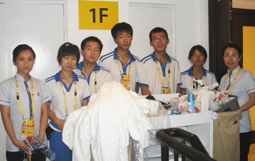 为了满足代表团在时间上的特殊需要,部分公寓楼将本应上午进行的做房工作移到晚上运动员离开之后。直到夜里23点,许多楼里的服务生仍然坚持作业,紧张而有条不紊。在工作人员和各国运动员一起围坐在电视机旁,为奥运会开幕盛典惊叹欢呼的时候,我校居民服务中心的前台服务生们仍坚持值岗,微笑服务,认真履行着自己的职责。