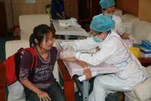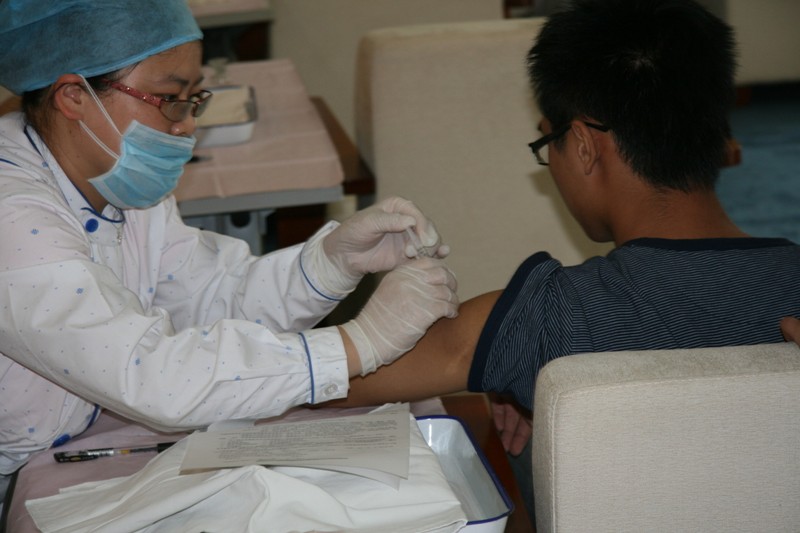9月22至23日,学校组织全体参加国庆游行的师生接种甲流疫苗,此次疫苗接种坚持免费自愿的原则。接种过程中,同学们排起了长长的队伍,等待着注射的开始。队伍井然有序,但人群却又不失活力,同学们都在愉快的交谈着。医务人员熟练而认真的为同学进行着酒精消毒,注射等一系列工作。在注射过程中,同学们或表情严肃或谈笑风生地配合着医生的工作。人群的秩序与医务人员的耐心工作态度构成了一道不可多得的风景线。