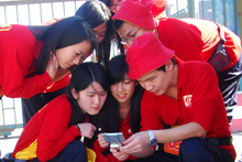 舞蹈队的出发时间定在11点半,而这正式我校首都国庆群众游行“艰苦创业”方队经过天安门的时间,同学们在集合区急切地想知道我校游行方阵的情况,情急之下,同学们拿出手机,通过网络电视观看群众游行方队的盛况。在看到我校的学生簇拥着花车走过天安门广场时,大家不禁发出了阵阵欢呼。“太激动了!”舞蹈队的孙奇同学说道:“看着他们从天安门前走过,手举花环,感觉身体里热血在沸腾!”舞蹈队的崇小萌同学十分地兴奋,“看到了他们的出色表现,我也下定决心,要将自己最美丽的一面在天安门前展现!”澎湖同学也表示:“我们平时训练很紧张,在上周日刚刚增加了很多节目,都是这几天赶练完的,今天一定不会出错!”
