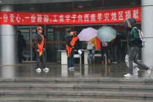 根据团中央的统一部署,3月30日中午,校团委组织开展了“一份爱心,一份鼓励,工商学子向旱灾地区捐献一瓶水”活动,活动在良乡校区和阜成路校区同时进行,细雨中,师生争相捐款,情意浓浓。