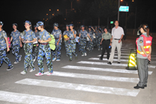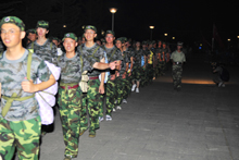 夜幕降临,整个军训团却士气高昂,一面面迎风招展的营连旗引领着队伍在夜色中不断前进。军训团总指挥、党委副书记卢思锋,军训团团长吕彦华中校,学生处处长兼军训团政委吕素香,保卫处副处长兼军训团副团长陶伟,军训团副团长徐红京,团委书记、军训团副政委吕良,军训团参谋长郭建荣,各学院辅导员以及所有参训官兵陪同参训学员一起走完全程。