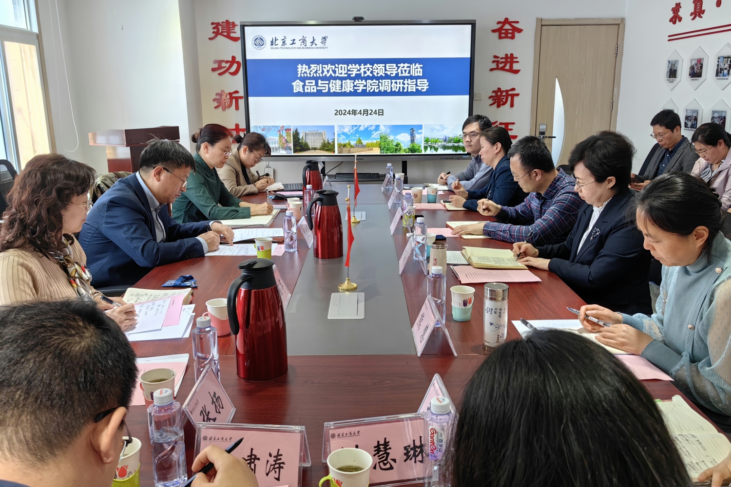 4月24日,学校党委副书记、校长郭建华带队到食品与健康学院调研指导,听取关于学科建设、推进双一流创建等情况汇报,与学院领导班子成员、教师代表座谈交流。党政办公室主任王晓华、人事处处长高丽华、研究生院副院长张倩和党政办公室副主任张扬一同参加调研。轻工与食品学部主任王静、食品与健康学院领导班子成员、各系(中心)负责人及教师代表参加座谈。座谈会由学院党委书记郑喜姣主持。