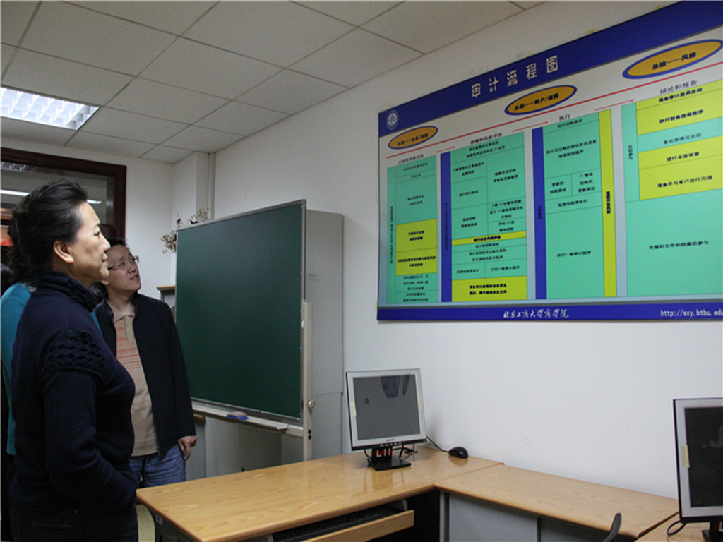 听取汇报后,评估组在欧阳爱平副院长的陪同下参观了学校多媒体教学中心和文科实践中心,对注册会计师专业方向教育的相关软件和硬件条件进行了检查。之后,评估组回到商学院办公楼分别进行了注册会计师专业方向核心课程任课教师座谈会和注册会计师专业方向学生座谈会。座谈会后,评估组前往文二楼听了注会091班的注册会计师专业方向核心课程。