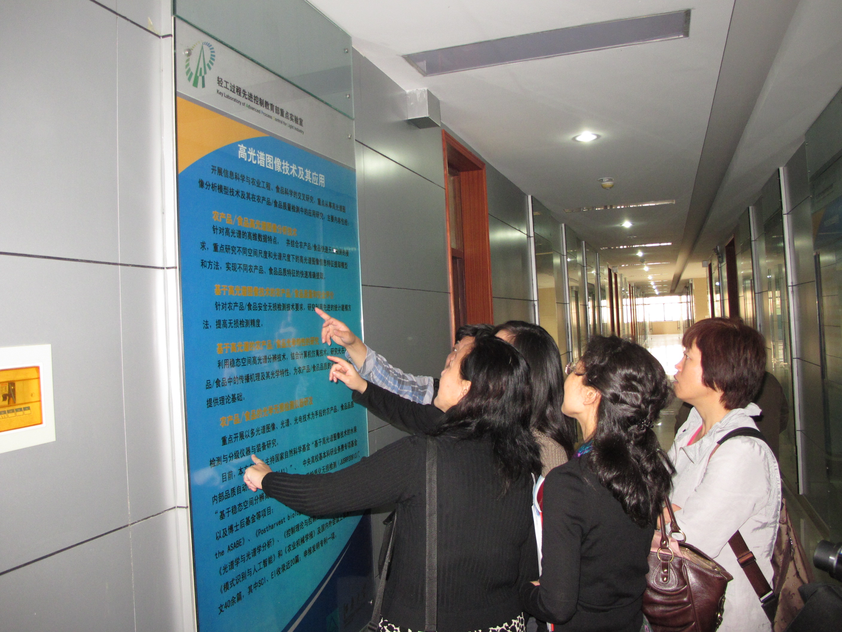 10月14日,计信学院一行与江南大学物联网工程学院领导及相关教师进行友好会面和深入交流。该院副院长潘丰教授和我院书记陈谊教授分别介绍了各自学院的专业设置、学科建设、队伍建设、科研工作、人才培养、学生就业、学院管理体制与机制创新、教师考核与奖励机制等方面的情况,双方教师就有关问题进行了深入的交流和讨论。随后我院教师重点参观了该学院的“轻工过程先进控制教育部重点实验室”,在实验室中,潘丰院长详细介绍了实验室的实验条件和设备资源,潘丰院长对研究生管理、项目申请机论文发表等方面进行了详细介绍,并与我院调研老师交流意见。实验室研究生对实验室的当前项目进行了深入介绍,着重参观了“高光谱图像处理”、“超声波生物优化”、“机器视觉”等方面的项目及成果,并就其中的技术细节进行了交流和探讨。在“化学检测”实验间中,参与调研的各教师对学科结合的优异性感触颇深,表示应在我院加强学科交叉等方面的工作。