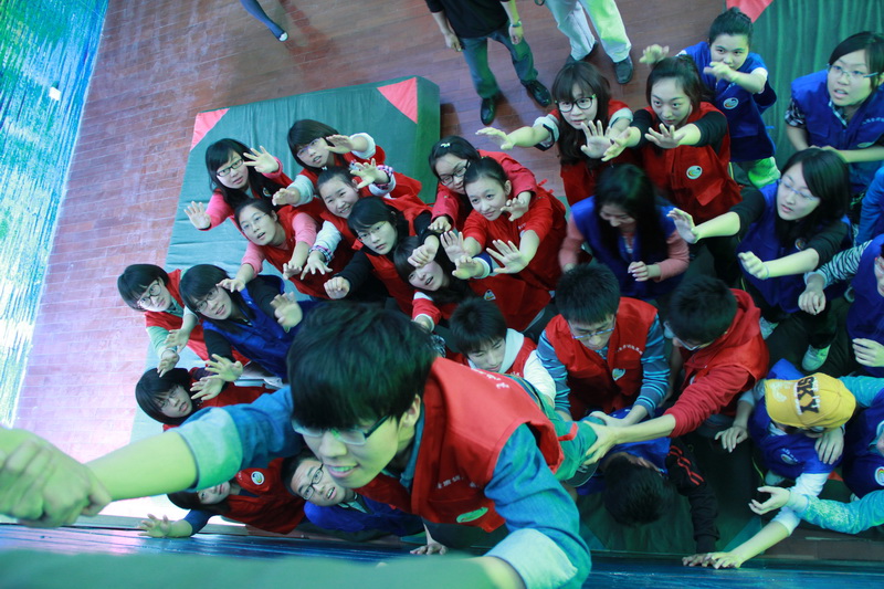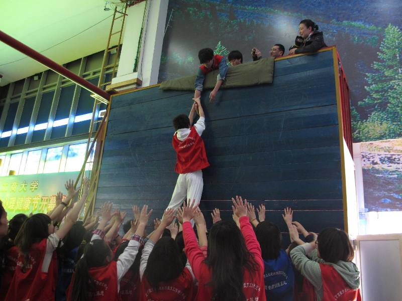 开幕式结束后,与会的领导、老师和同学们来到训练馆外,在拼成学校英文缩写字母的心语卡片上写下心愿和祝福。随后,辅导员与同学们进行了素质拓展训练活动。