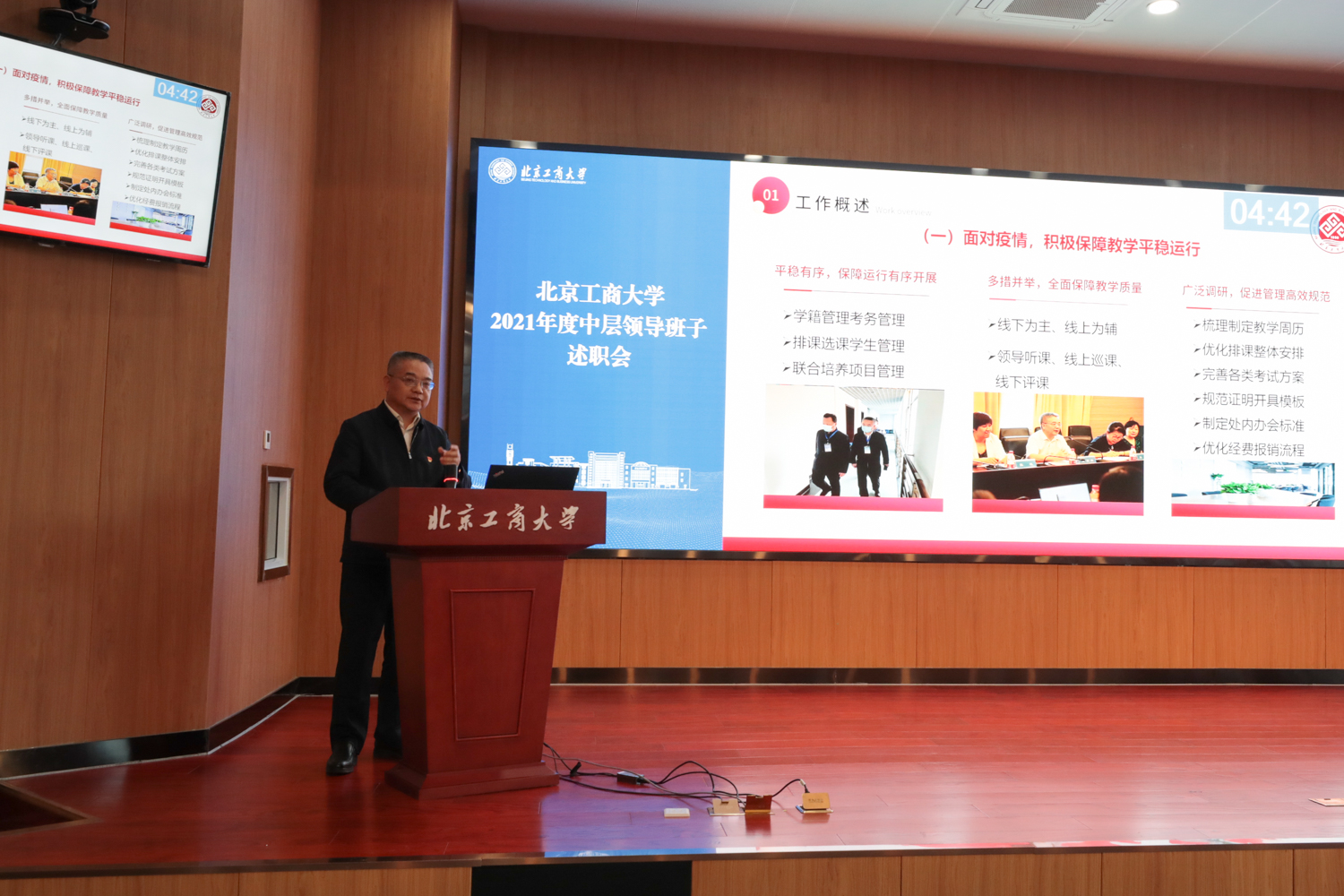 根据学校中层领导班子、中层干部考核工作安排,由各二级单位行政负责人依次代表领导班子对年度工作进行述职。43家二级单位负责人根据本单位自身职责定位,围绕学校党政工作要点、十大重点工作任务等内容,涵盖党的建设、班子自身建设、党风廉政及作风建设等方面情况,以文稿演示形式汇报了2021年工作完成情况、存在问题,展示了取得的工作业绩,并对2022年重点工作进行展望。
