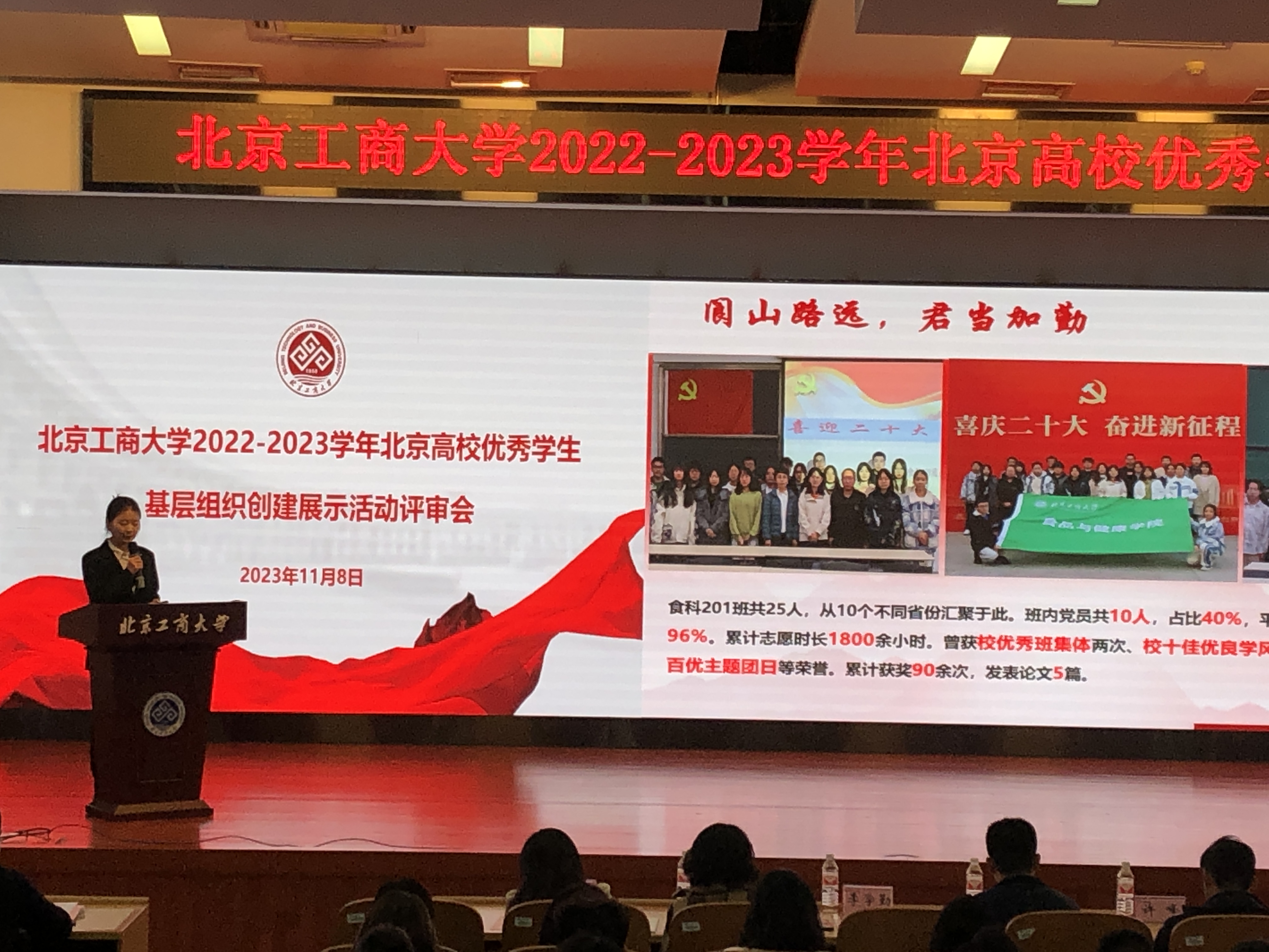 随后,竞选市级优秀学生基层组织的每个候选班级和宿舍一名代表按照抽签顺序依次上台,以4分钟文稿演示汇报形式展示了理论学习、学风建设、团队凝聚力、科研、学科竞赛、志愿服务等各方面开展的工作和取得的成绩。学生代表展示完毕后,教师评委在组织管理、如何取得优异成绩等方面进行了提问。