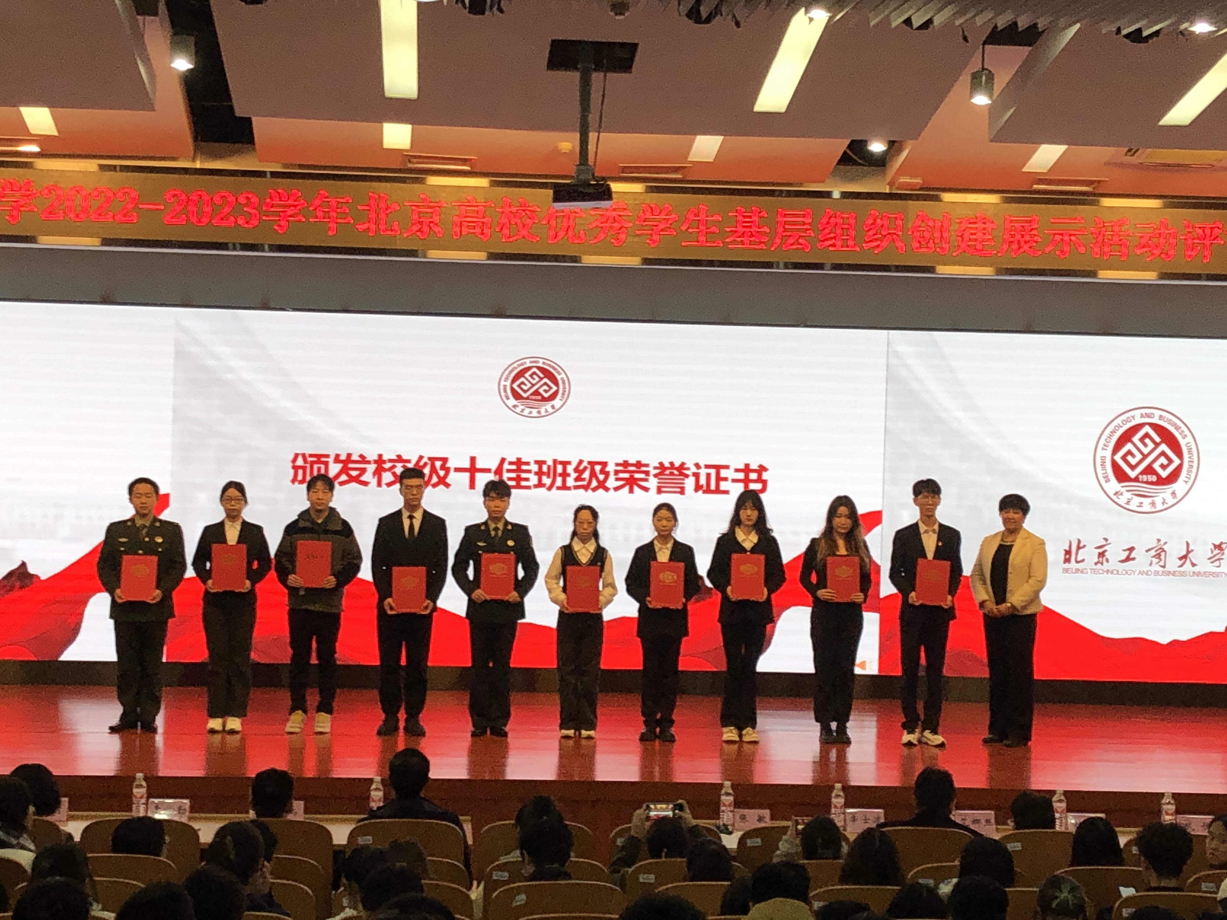 在开展市级优秀基层组织评选之前,许峰、张敏分别为校级“十佳宿舍”和“十佳班集体”颁发了荣誉证书。