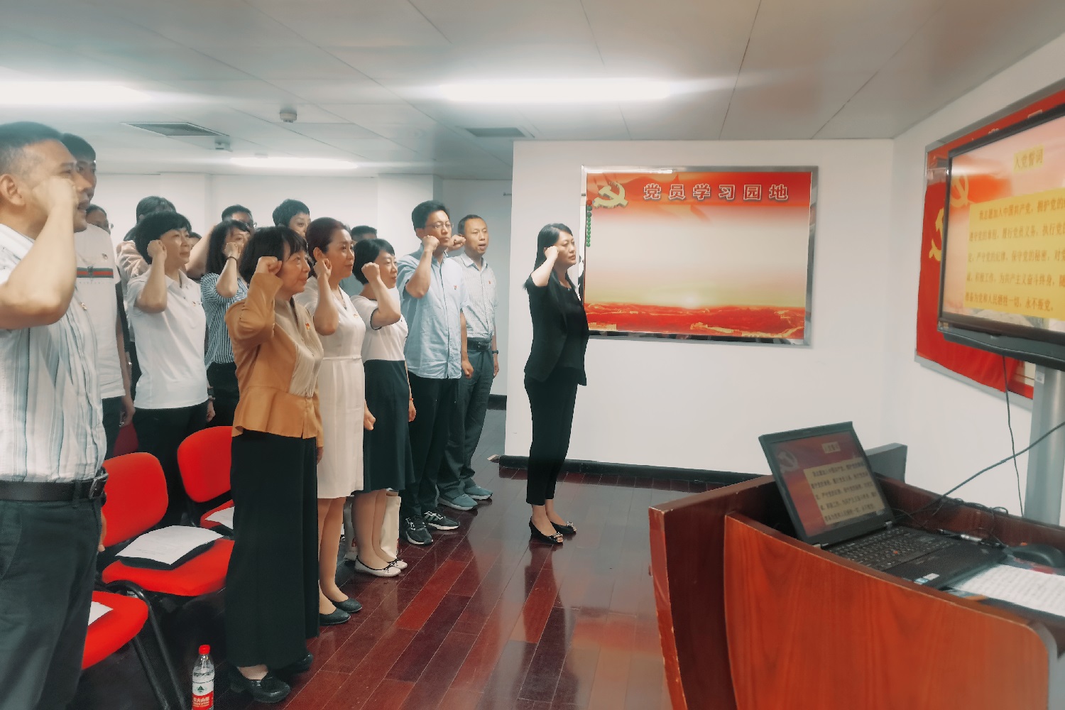 全体党员庄严肃立,面向党旗,举起右拳,在刘萍的带领下重温入党誓词。