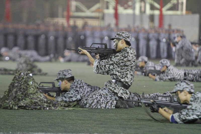 硝烟战场,何谈退缩与胆怯。四营的110名男生盛着军人的意志与刚强为大家带来了刺杀操表扬。他们手持木枪,步伐坚毅,一招一式尽显男儿本色,展现出军人的飒爽英姿。