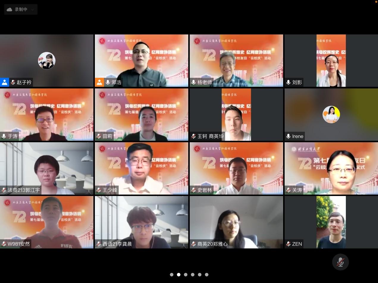 外国语学院以“筑母校辉煌史 忆同窗外语情”为主题举办“云校庆”活动,学院领导班子成员、教师代表、校友代表以及在校生代表80余人在云端相聚。会上介绍了学院近几年的发展成绩和未来规划,号召全体师生和校友共同努力,助力学院高水平发展。98级校友安然、王少峰、刘洋分享了各自的成长经历,并为学弟学妹进行职业规划指导。
