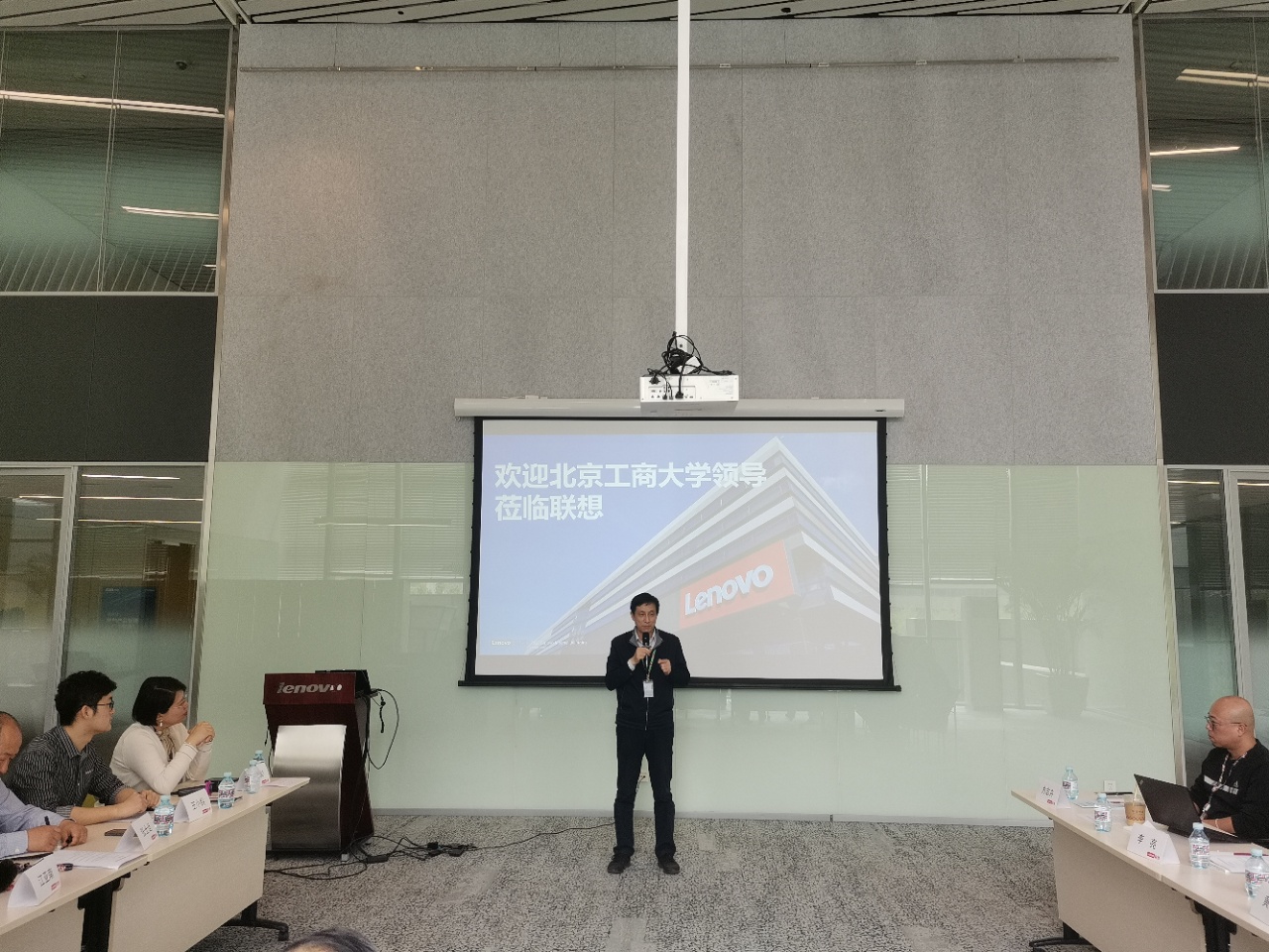 学校调研团在联想集团高教客户经理潘思彤等人的陪同下参观了联想集团全球未来中心和可靠性综合环境实验室。随后双方领导及成员会面,并就科技项目合作、实验室建设、人才培养及就业等领域进行商讨。