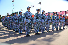 全场最辛苦的人当属教官们了。黝黑的面庞,标准的示范,有些沙哑却仍旧响亮的命令。一人一个队伍,不厌其烦地示范着,严格甚至苛刻地追求每一个动作的完美。看似不近人情的他们,偶尔的腼腆表情却又叫人觉得可爱;看似铁面无情的他们,时而搞怪的模仿又叫人忍俊不禁。训练时,有人掉了腰带却不敢吱声,教官细心地捡起腰带亲自送到学员面前,又不得不叫人感动。正是这一群与学生们年龄相仿的最可爱的人,给大家带来了最刚硬的品质和气度,也带来了温馨与愉快。