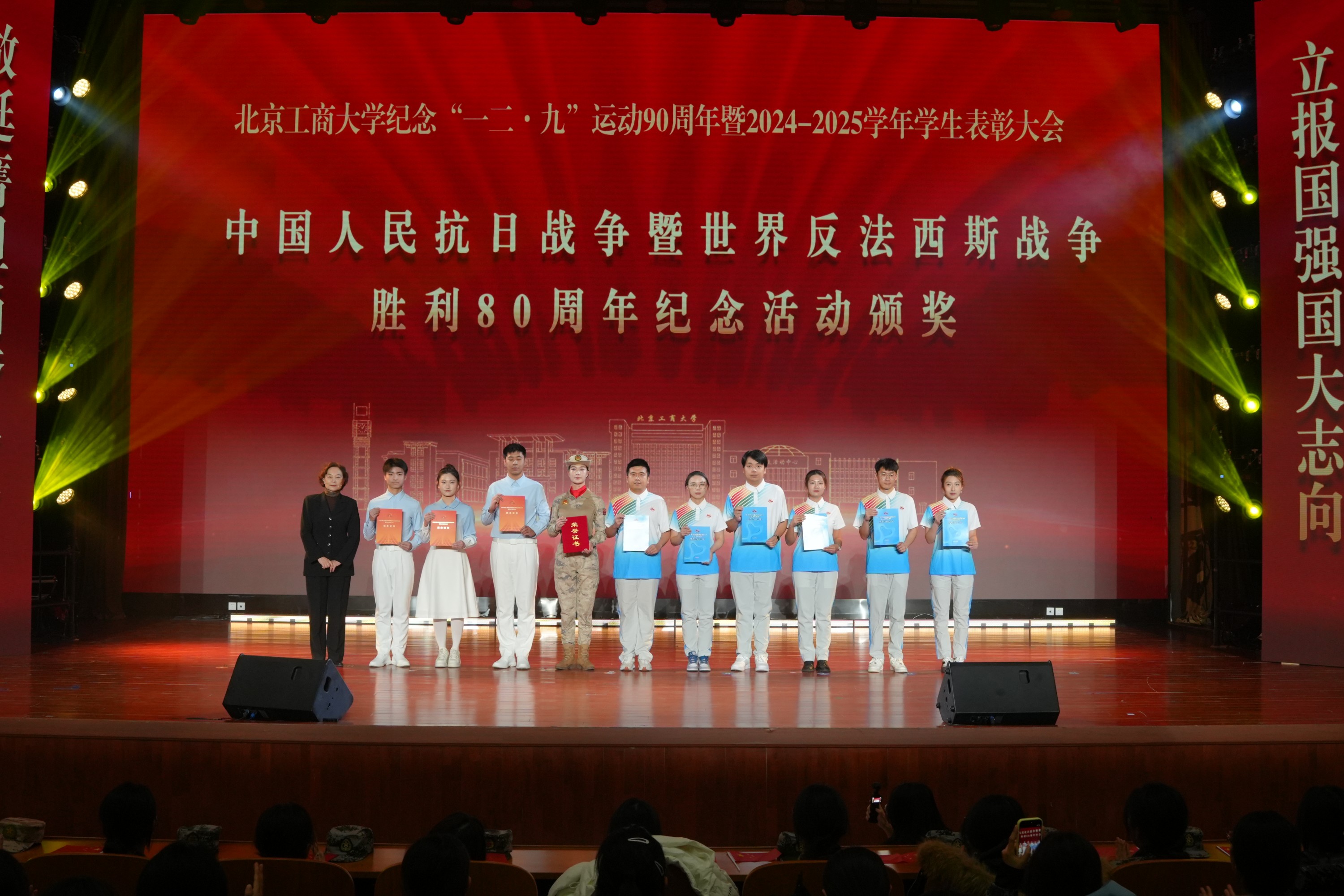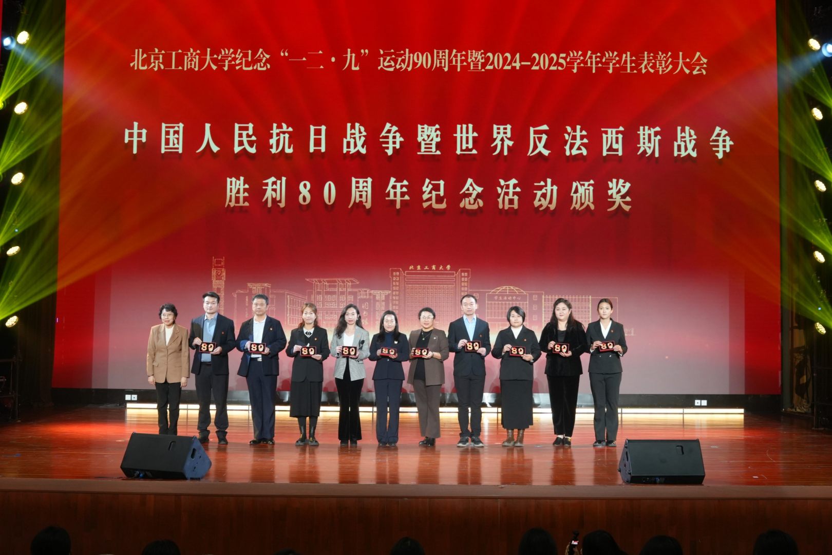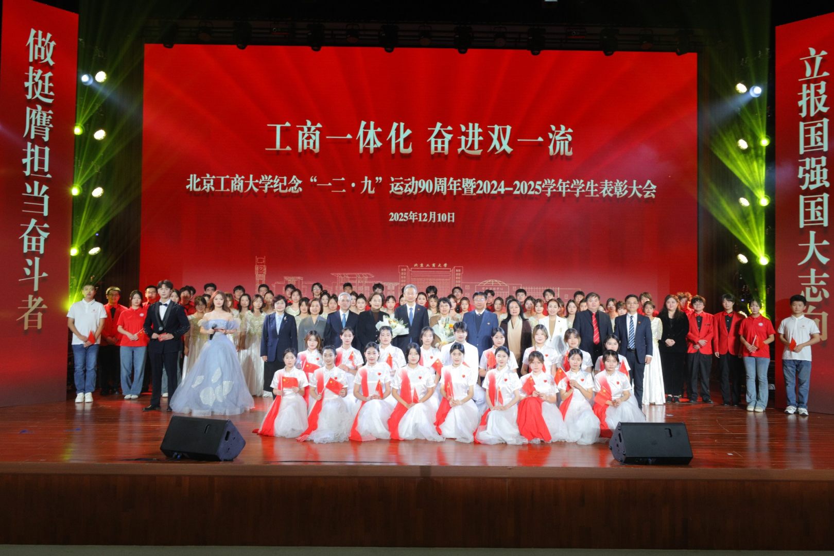 党委书记沈千帆讲话。他代表学校党委向所有获奖个人与集体表示最衷心的祝贺,向辛勤耕耘在育人一线的全体教职工致以最诚挚的敬意。沈千帆表示,七十五年来,学校始终与民族命运同频共振、与国家发展同向同行,作为学校发展的见证者和推动者,过去一年,2300余名北工商学子荣获校级及以上荣誉称号,7600余人次斩获各类奖学金,68个先进班集体脱颖而出,校长奖学金获得者中半数以上已保送顶尖高校深造,多个团队在“挑战杯”“互联网+”等赛事中屡创佳绩,充分展现了同学们过硬的本领和昂扬向上的精神风貌。他为同学们提出三点希望:一是赓续红色血脉,在“爱国奉献”中锚定精神坐标。厚植家国情怀,把爱国情怀转化为奋进力量。二是锻造坚毅品格,在“敢闯敢拼”中筑牢成长根基。将先辈们不畏艰险、勇毅前行的精神基因融入血脉,用坚毅品格托举青春梦想。三是坚持知行合一,在“善作善成”中书写青春答卷。深耕专业沃土,让创新成果绽放在中国式现代化的壮阔征程中。希望同学们坚定不移听党话、跟党走,努力成长为有理想、敢担当、能吃苦、肯奋斗的复合型创新人才,在强国建设、民族复兴伟业中勇担重任、展现风采、贡献力量,书写为中国式现代化挺膺担当的青春篇章。