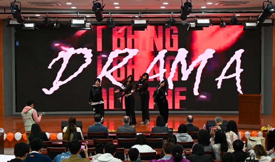随后举行师生联欢。谭雨宸演唱旋律优美的歌曲《A thousand years》,随后,古筝独奏《春到拉萨》悠扬奏响,顾佳铭用琴音将众人带入美丽的拉萨之春,传递出跨越国界的友谊与和平愿景。由张馨莹演唱的《love yourself》,通过励志主题和动感旋律,展现了北工商学子的自信风采,再次将气氛推向高潮。2020届毕业生常可潆朗诵的《精算筑梦·十载辉煌》,深情表达了对项目十年岁月的感悟和对未来发展的美好祝愿;张清桠同学朗诵的《十年华章,共谱辉煌》表达了在中外办学项目的培养下,学子们绽放青春华章,书写灿烂明天的壮志。杨添乐等同学合唱《稻香》,在悠扬的歌声中,学生代表为考克大学教师送上鲜花和礼物,再次对他们的到来表示欢迎。