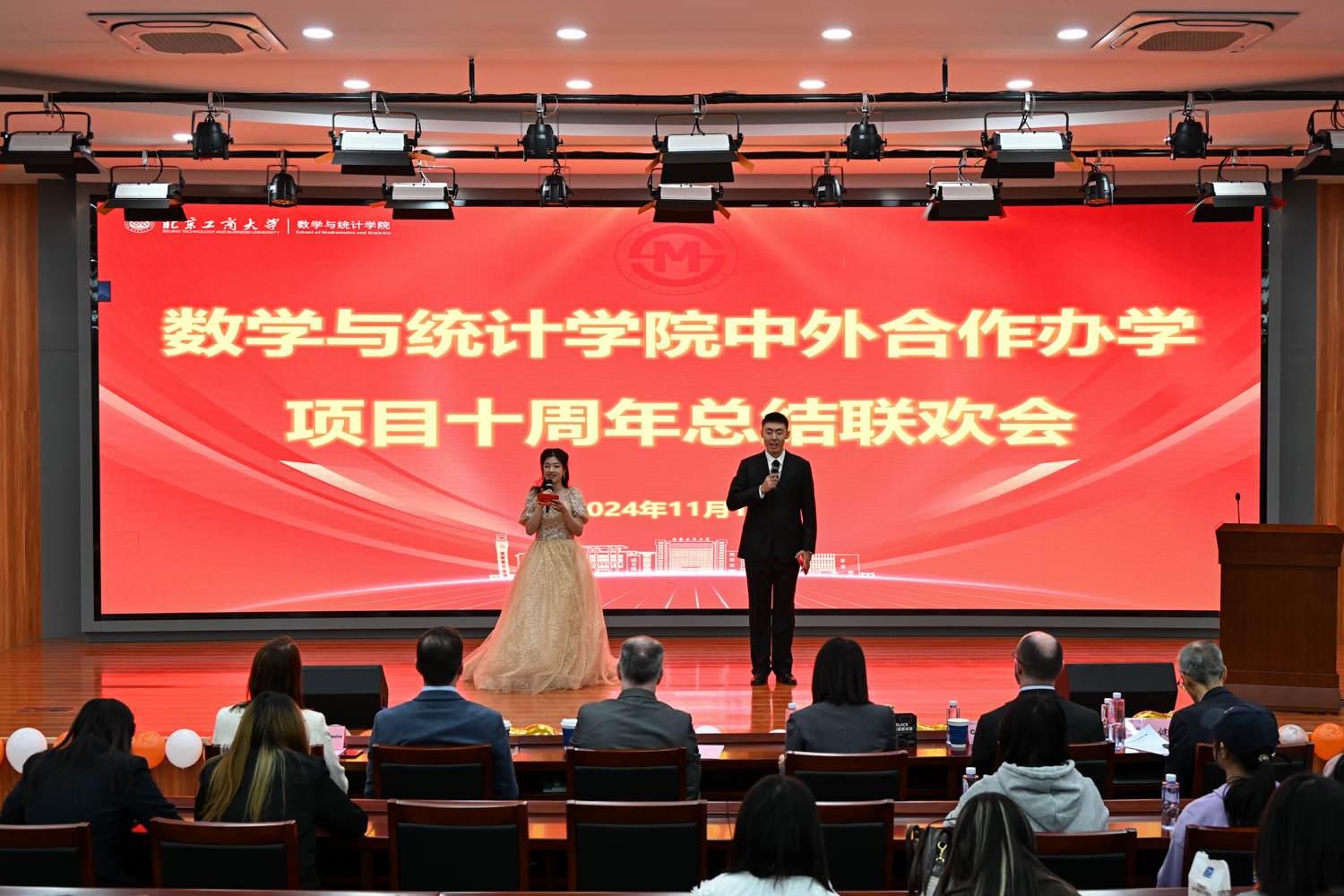 11月12日下午,中外合作办学项目十周年总结联欢会在良乡主校区求真学堂举行。学校副校长刘艳楠出席大会,考克大学数学学院院长凯文·海耶斯,办公室主任凯瑟琳·马奎尔,教师代表埃里克·沃尔斯廷斯基、康纳尔·凯利、黄健,考克大学中国办公室刘畅、王秋楠,国际交流与合作处处长贺冬萌、数学与统计学院领导班子、教师代表和应用统计(中外)班23级、24级本科生参加活动。活动由数学与统计学院党委书记周艳杰、应统 24(中外)班学生魏博、张清桠主持。