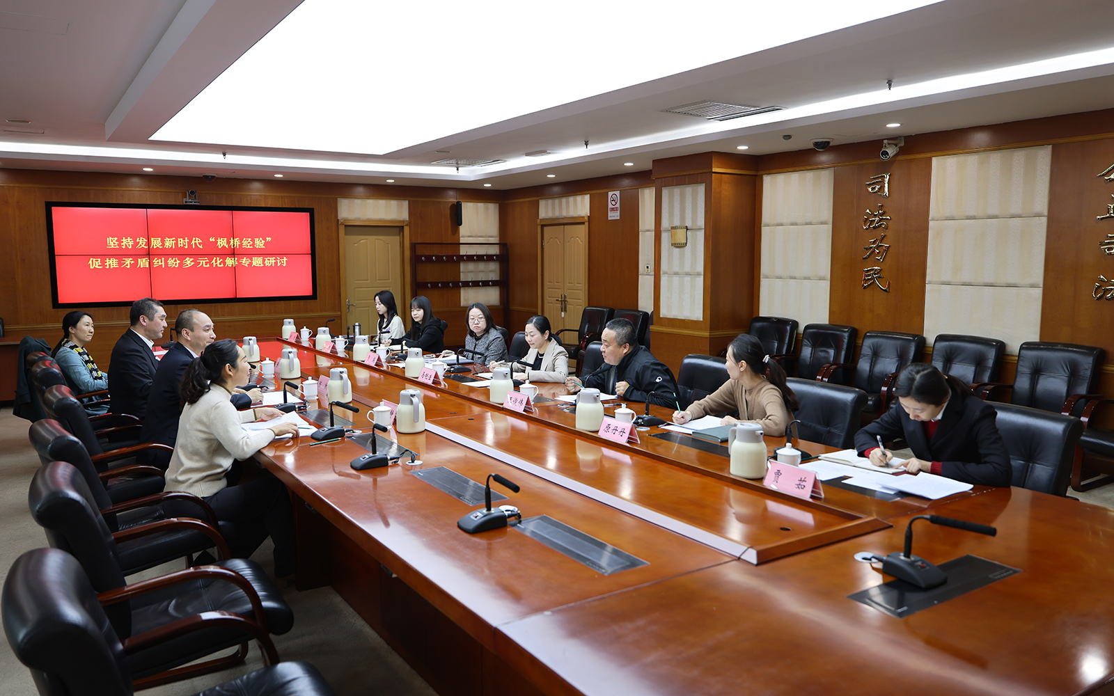 座谈会后,双方还共同举办了以“坚持发展新时代‘枫桥经验’促推矛盾纠纷多元化解”为主题的专题研讨活动,会议由张龙主持。房山区人民法院立案庭庭长王俊伟、审管办主任贾薇、审管办副主任原丹丹分别围绕法院近期的立案分流情况、审判监督情况和司法科研情况进行了说明和阐释。陈敦、郭纹静、王晴分别对前述发言进行点评和提供建议。最后,双方围绕共同关心的司法实务以及教学科研等问题,展开了热烈讨论。