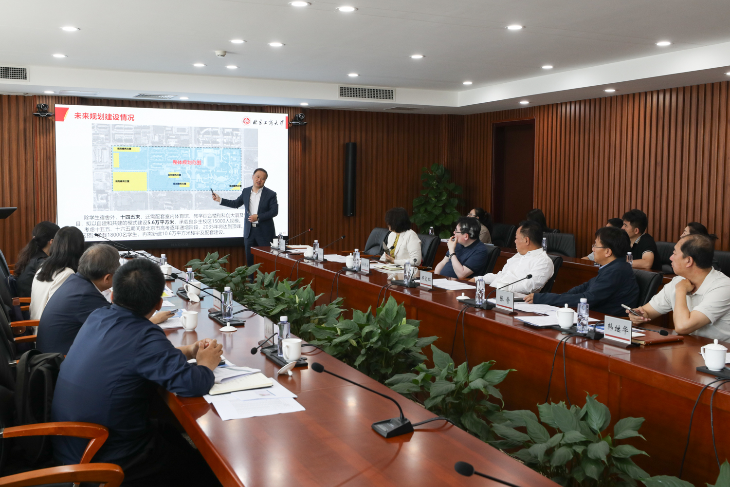 王方、张奇等一行先后实地走访了AB座教学科研楼、良乡主校区总配电室、新建宿舍楼地块,察看项目建设情况,了解学校AB座教学科研楼竣工验收事宜、配电室建设、外电源接入情况,以及新建学生宿舍项目规划设计及建设指标需求情况。随后召开座谈会,与会领导详细听取了学校两校区功能定位及发展规划、良乡主校区建设发展亟需解决的困难及未来校园建设规划,郑文红、校园建设处处长秦东生先后就相关工作进行了汇报。