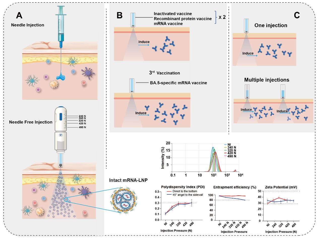 动物试验显示:无针注射相较于有针注射,能够使疫苗发挥出更好的免疫原性,测试疫苗包括mRNA-LNP疫苗、灭活疫苗、重组蛋白疫苗;Omicron BA.5特异的mRNA-LNP疫苗可以作为有效的加强针选择,增强抗Omicron免疫亚型的病毒中和能力,无论在此之前接种的是灭活,重组蛋白还是mRNA新冠疫苗;在一次免疫中,将疫苗剂量分为多等分,于不同部位进行无针注射,将更有助于疫苗发挥效力,这一发现或可作为未来疫苗免疫接种的优选方式;经过优化的无针注射系统能够很好配合mRNA-LNP颗粒的稳定释放,为其在其他类型疫苗和药物上的应用打开了探索的大门。