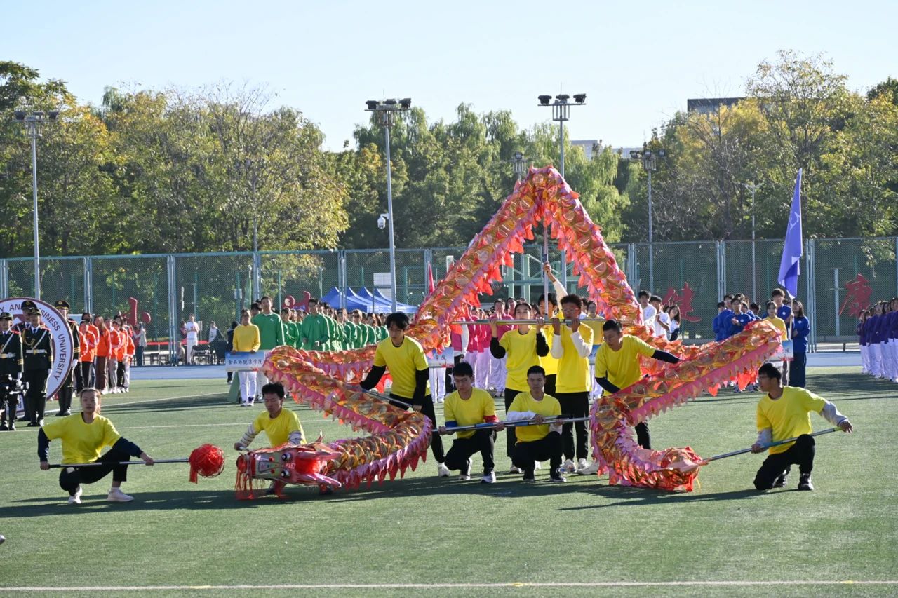 锣鼓喧天声声昂,双龙戏珠冲云霄。我校舞龙队带来精彩绝伦的表演。队员们手持游龙,振臂有力,步履协调。握、捻、转、摇一套动作干净有力、行云流水。两条游龙在霁蓝的赛道上腾空跃起,象征着色情片将如巨龙般腾飞跃进。