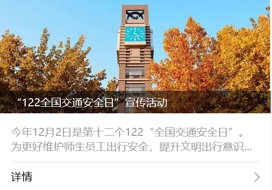 活动引领,做到师生广泛参与。各学院召开交通安全主题班会,将交通安全理念内化于心,外化于行,固化文明出行习惯。保卫处开展“文明交通 共建共享”交通安全演讲活动,组织选手参加海淀区高校系统演讲比赛,最终在30所高校角逐中取得个人三等奖的优异成绩。