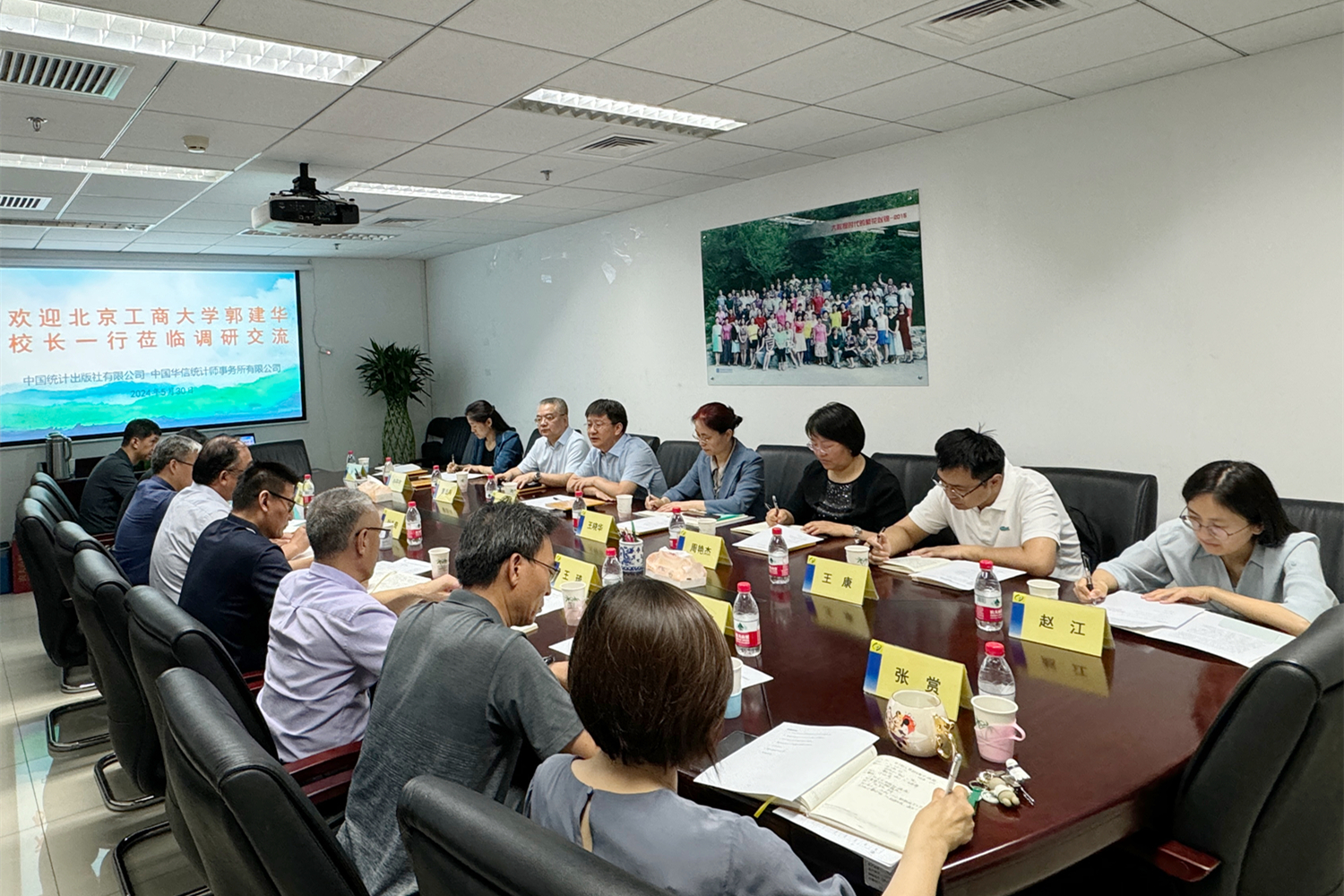 中国统计出版社有限公司党委书记、社长兼总编辑叶礼奇,中国华信统计师事务所有限公司所长霍丙森对郭建华一行表示热烈欢迎,并对企业的发展历程、发展规划、业务范围、人才招聘、人才需求等情况进行了详细介绍。他们表达了与我校的深厚渊源,感谢我校为企业培养和输送优秀人才,表示将深入落实习近平总书记在5月27日中共中央政治局第十四次集体学习时强调促进高质量充分就业的讲话精神,发挥企业的责任和担当,通过深化校企合作,共同搭建高素质人才培养平台,促进学生成长成才和高质量充分就业。