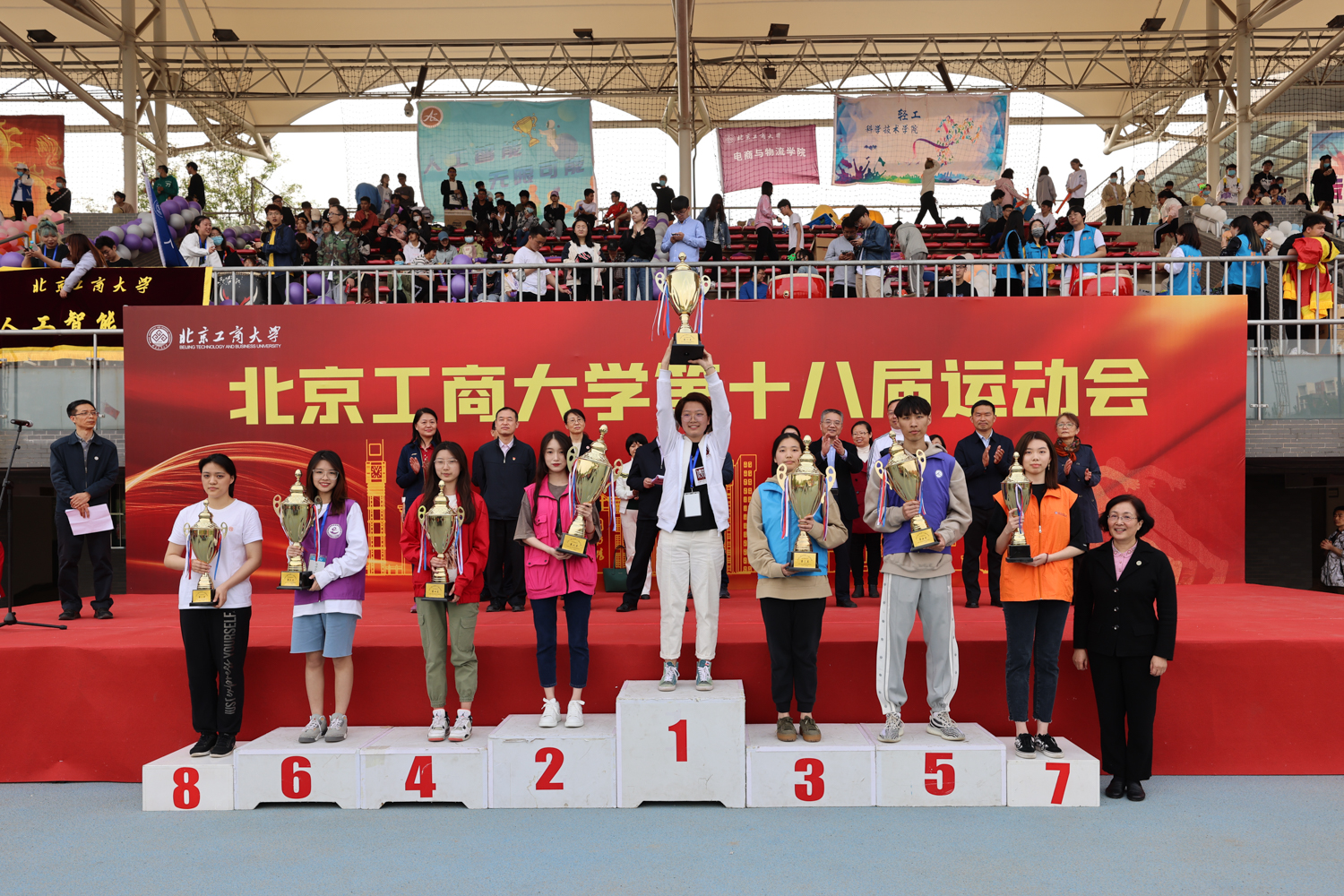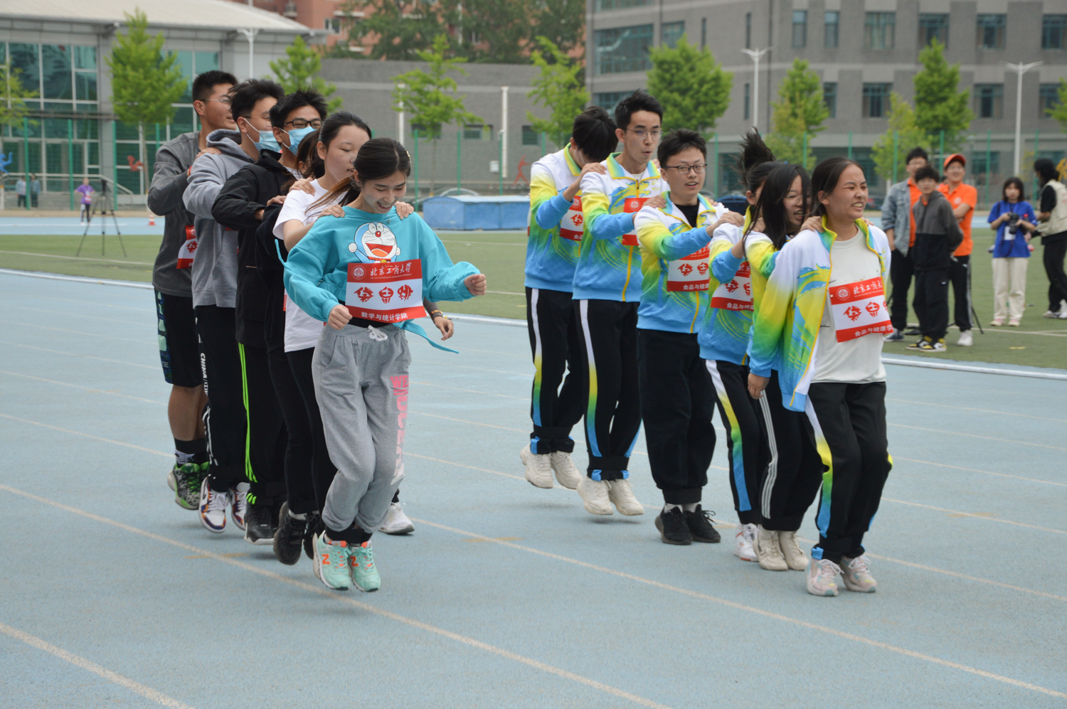 比赛开始,运动健儿们在田径赛场上拼尽全力、奋勇争先。在趣味项目中,各组运动员团结一心、步调一致,展现了北工商人的凝聚力。
