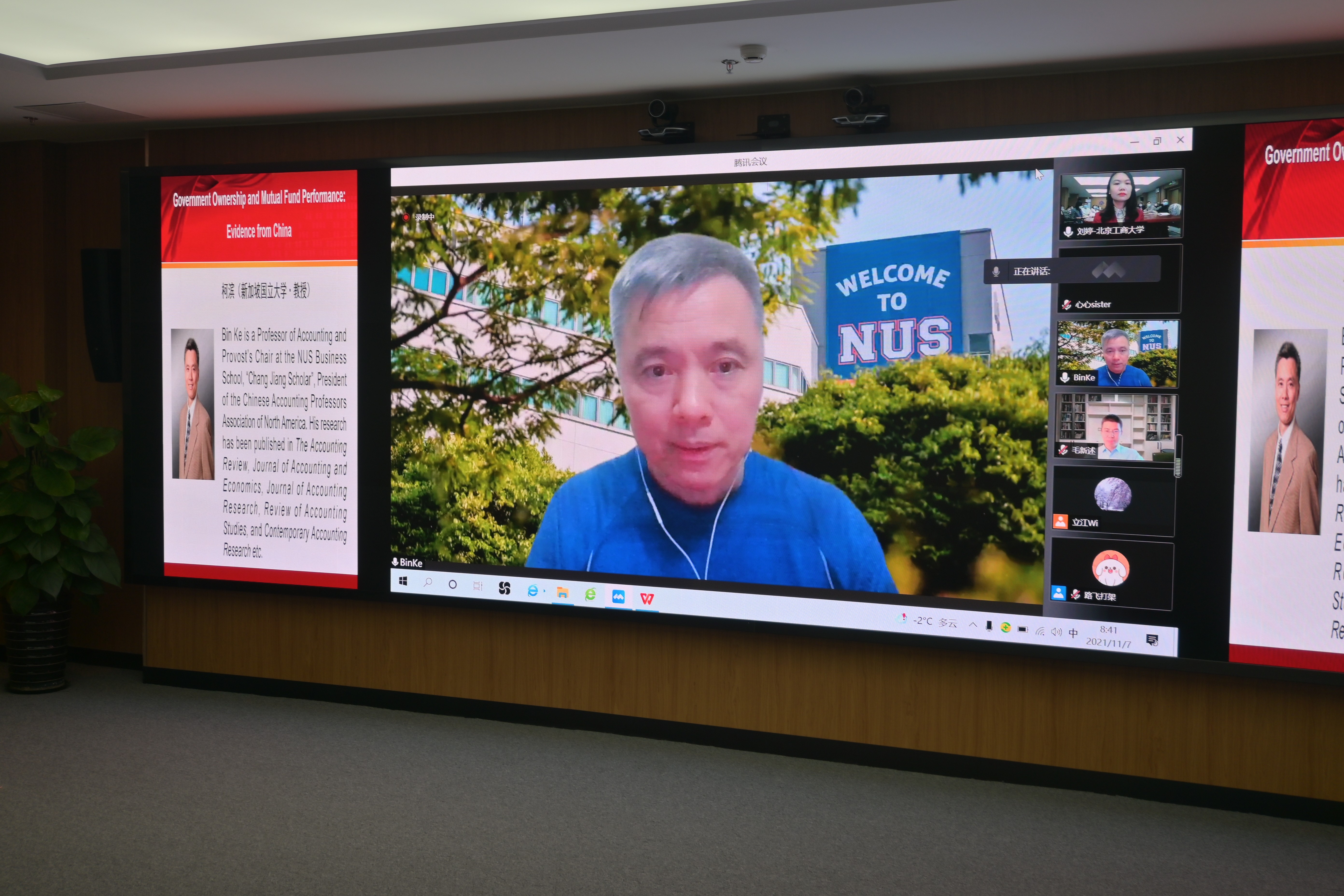 商学院院长毛新述为研讨会致开幕词。毛新述对与会专家学者长期以来对学院学术发展的支持和帮助表示感谢。柯滨教授和陈旸旸教授分别作了题为“Government Ownership and Mutual Fund Performance: Evidence from China”和“Auditor Liability, Litigation Risk, and Corporate Tax Avoidance: Evidence from a Quasi-Experiment in the U.S.”的主题报告。第一分会场“资本市场与企业创新”报告并点评两篇论文,由彭红星主持。第二分会场“国企改革与社会责任”报告并点评四篇论文,由刘婷主持。第三分会场“资本市场与媒体监督”报告并点评三篇论文,由鲁昱主持。线上与现场学者就论文进行了热烈而充分的讨论。