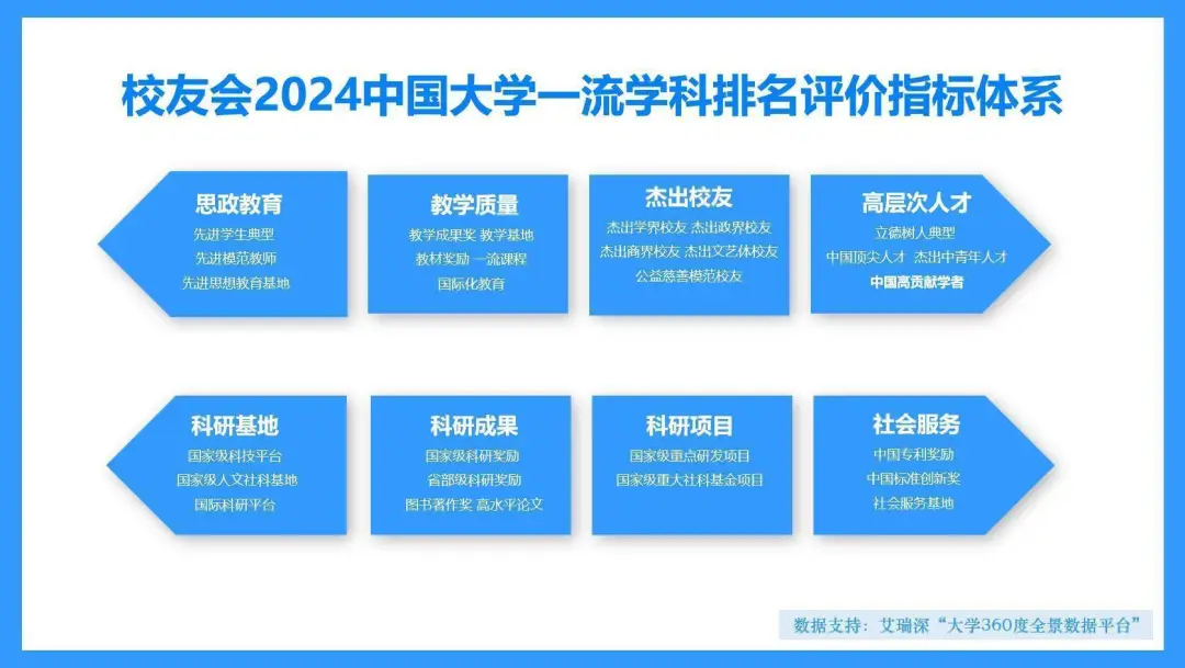 校友会中国大学一流学科排名评价指标体系由思政教育、教学质量、杰出校友、高层次人才、科研基地、科研成果、科研项目和社会服务等八大项一级指标组成,以艾瑞深“大学360度全景数据平台”为数据支持,围绕“大平台、大团队、大项目、大成果、大校友”对中国大学学科发展水平展开评价,涵盖200多项体现中国大学学科建设水平的核心评价指标,指标数据全部来源于教育部、科技部、人事部、第三方机构和高校等对社会公开的权威数据与客观数据。引导中国大学扎根中国大地办教育,推进中国大学深化实施有组织的科研,解决卡脖子问题,提高服务国家地方经济社会发展的能力与贡献,助力中国大学加快“双一流”学科和省级高水平学科建设,增强学科核心竞争力与学科建设水平。