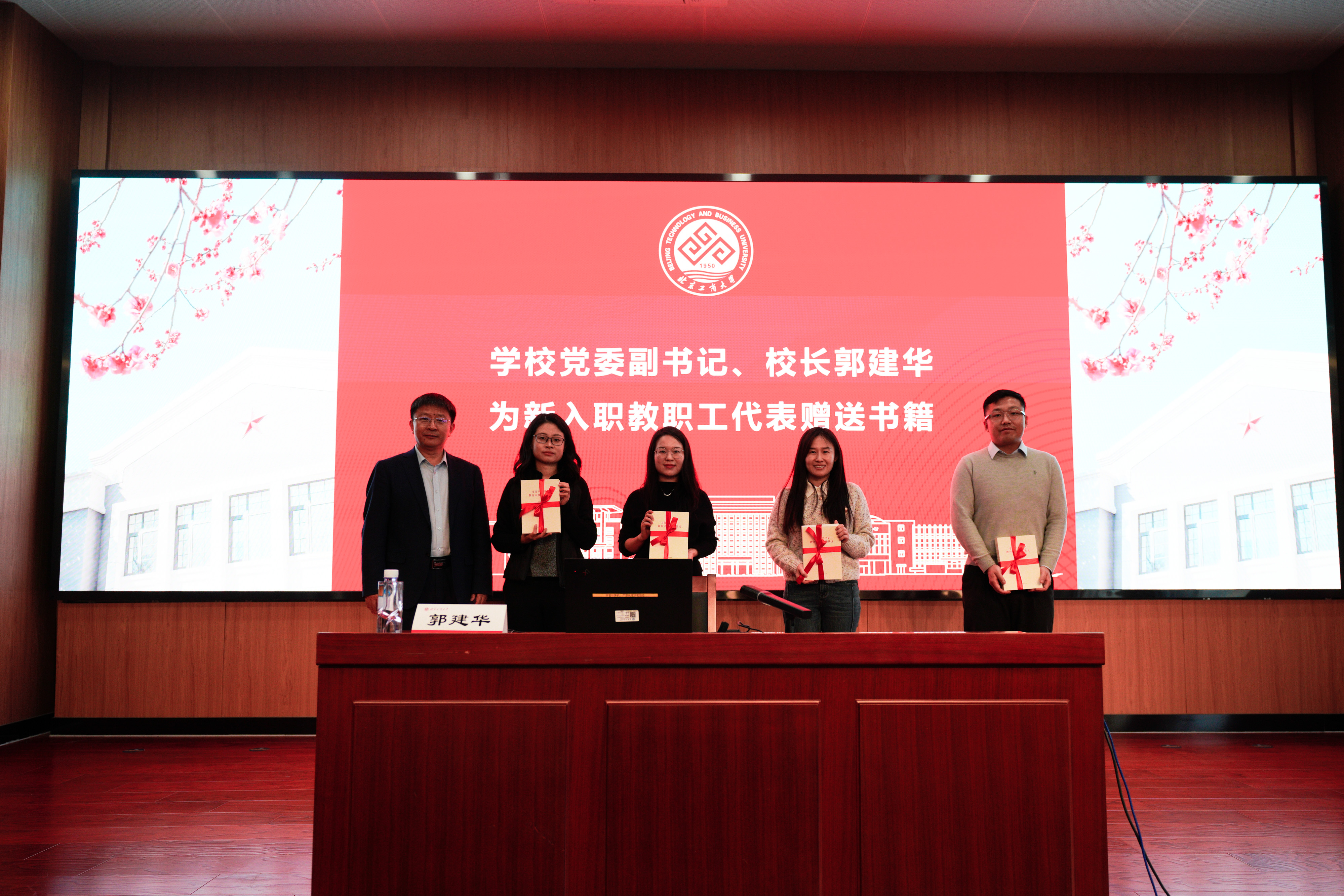 郭建华为新入职教职工代表赠送《习近平总书记教育重要论述讲义》一书。他希望新入职教师要坚定理想信念,强化理论学习,提高素质修养,增强能力本领,努力做政治过硬、业务精湛、作风优良的“研究型”青年教师。