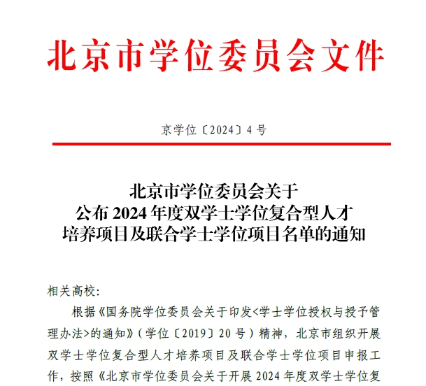 两个项目的成功获批,是学校坚持推动交叉复合型人才培养工作的重要体现,进一步拓宽学校创新人才培养体系。学校将继续坚持高起点、高标准、高质量的原则,紧扣双学士学位复合型人才培养项目的目标和定位,强化课程体系、课程教学、培养模式等方面的系统性设计,做好该项目的招生、人才培养及学位授予管理工作。同时,学校将加强专业内涵建设,发挥专业特色优势,促进人才培养质量持续提升,培养更多适应国家战略和首都经济社会发展需要的高素质、创新型、复合型人才。