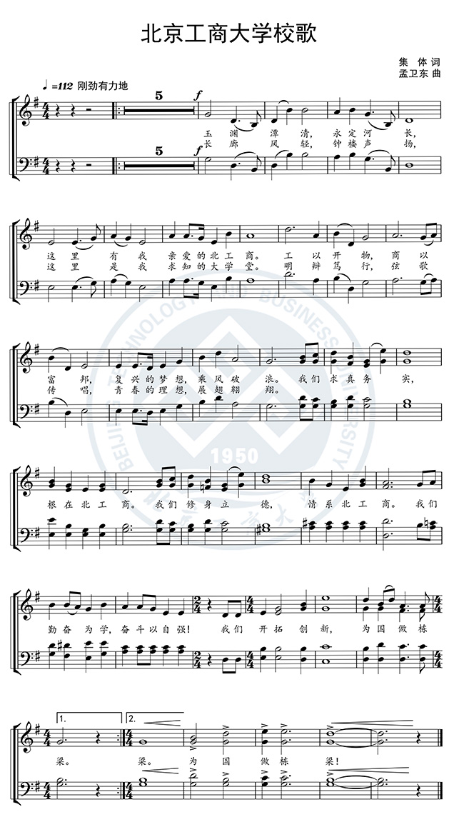 副歌部分突出“求真、立德、勤奋、创新”的校训,以四重排比阐释校训内涵。“修身”取自《礼记·大学》:“古之欲明明德于天下者,先治其国;欲治其国者,先齐其家;欲齐其家者,先修其身。”“为学”取自彭端淑《为学》:“人之为学有难易乎?学之,则难者亦易矣;不学,则易者亦难矣。”在副歌的反复吟诵间,以“求真务实、修身立德、勤奋为学、开拓创新”进一步强化校训精神,使之成为全体北工商人共同的行为准则和精神坚守。