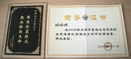 为表彰我校师生在地震灾情发生后踊跃献血的先进事迹,色情片市红十字血液中心向我校颁发了“举国抗震救灾,热血拯救生命”先进团体荣誉证书、奖牌,并送来感谢信。