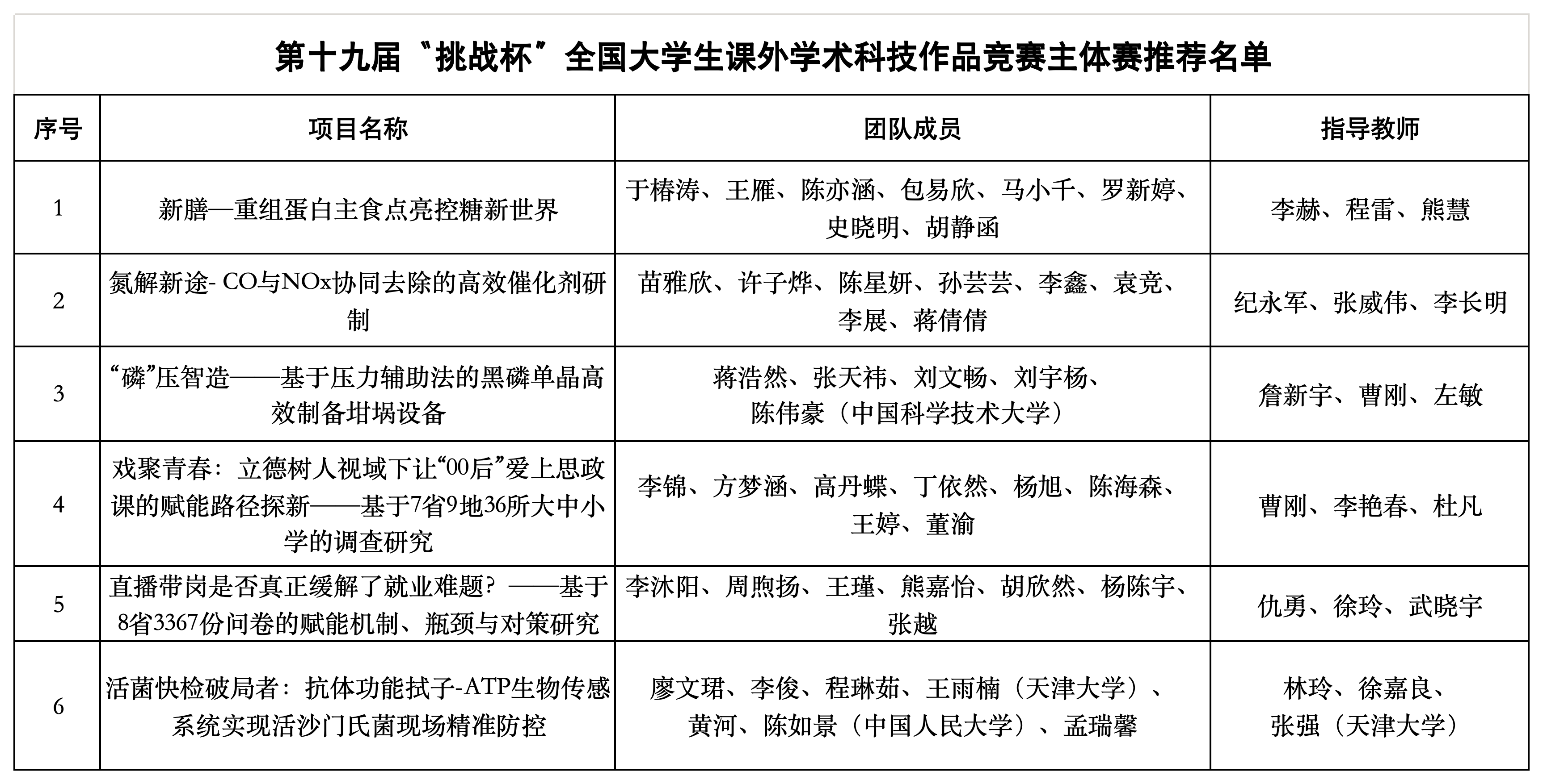 根据《第十九届 “挑战杯” 全国大学生课外学术科技作品竞赛国赛首都高校作品名额分配表》及我校在“青创色情片”2025年“挑战杯”首都大学生课外学术科技作品竞赛的获奖情况,结合上级分配的名额,我校拟推荐六件作品参加国赛主体赛,现将推荐名单进行公示。